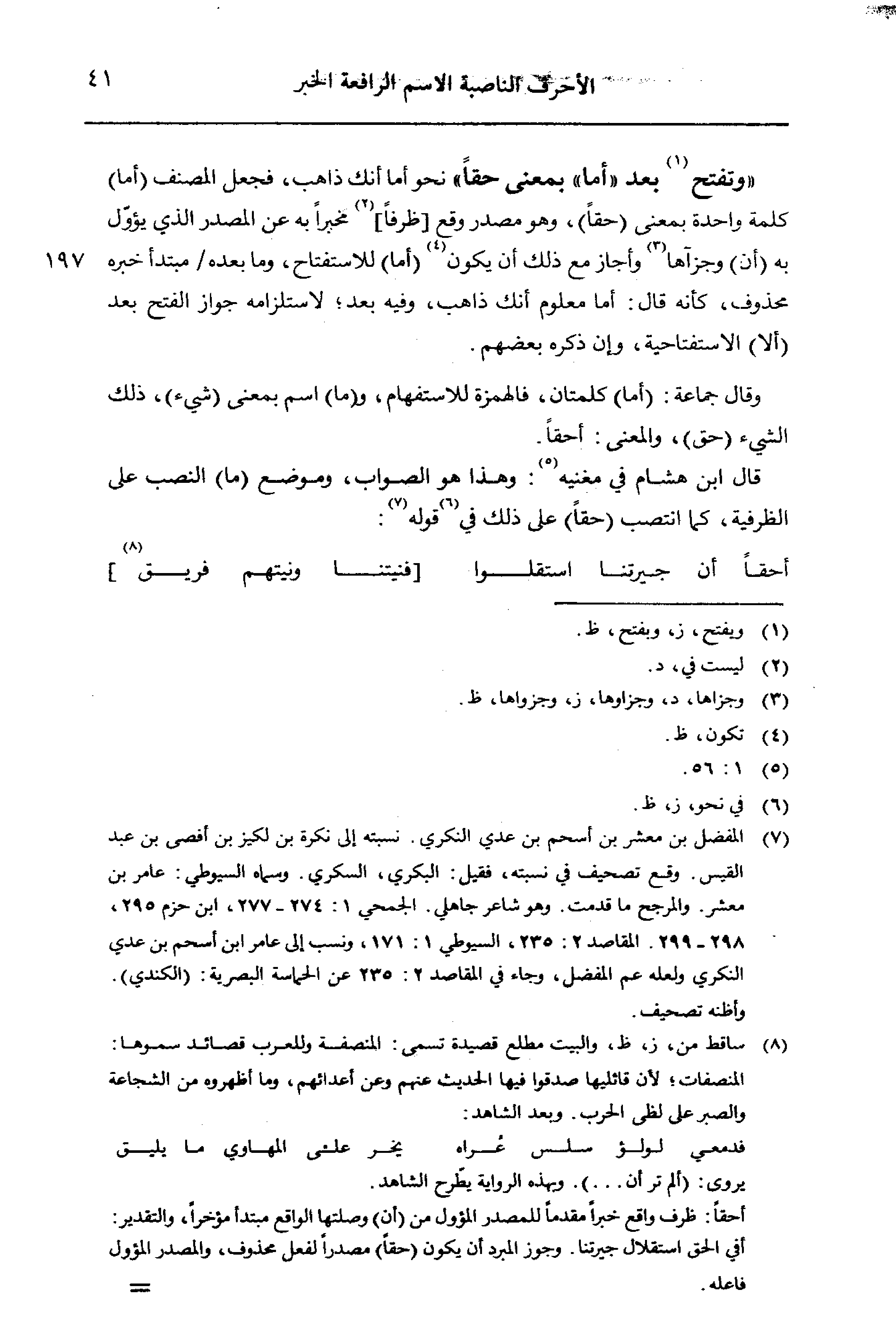 «وتفتح بعد «أما «بمعنى حقا» نحو أما أنك ذاهب، فجعل المصنف (أما) كلمة واحدة بمعنى (حقا)، وهو مصدر وقع [ظرفا] مخبرا به عن اتلمصدر الذي يؤول به (أن) وجزآها وأجاز مع ذلك أن يكون (أما) للاستفتاح، وما بعده/ مبتدأ خبره مخذوف، كأنه قال: أما معلوم أنك ذاهب، وفيه بعد؛ لاستلزامه جواز الفتح بعد (ألا) الاستفتاحية، وإن ذكره بعضهم.