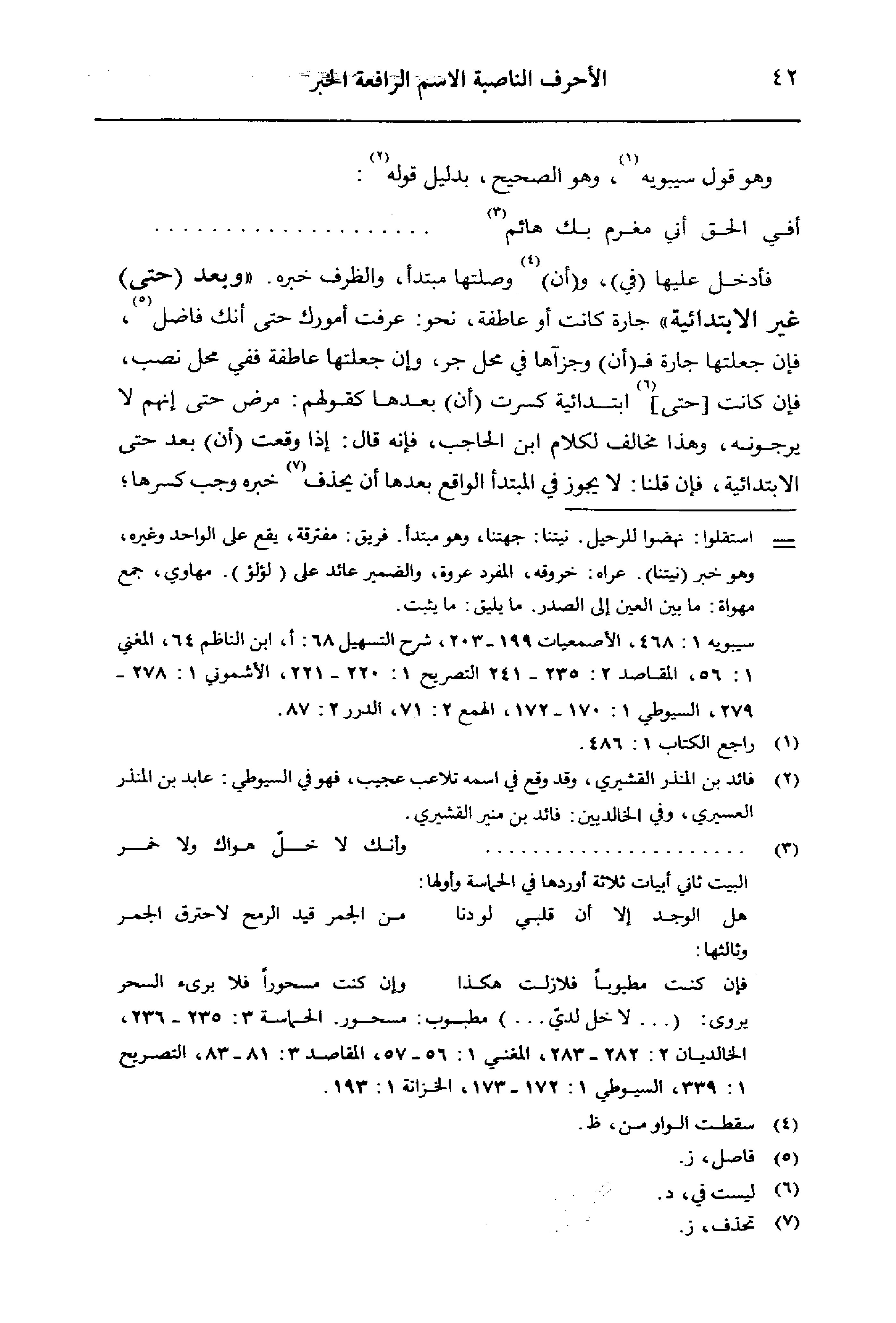 فأدخل عليها (في)، و (أن) وصلتها مبتدأ، والظرف خبره. «وبعد (حتى) غير الابتدائية» جارة كانت أو عاطفة، نحو: عرفت أمورك حتى أنك فاضل، فإن جعلتها جارة فـ (أن) وجزآها في محل جر، وإن جعلتها عاطفة ففي محل نصب، فإن كانت [حتى] ابتدائية كسرت (أن) بعدها كقولهم: مرض حتى إنهم لا يرجونه، وهذا مخالف لكلام ابن الحاجب، فإنه قال: إذا وقعت (أن) بعد حتى الابتدائية، فإن قلنا: لا يجوز في المبتدأ الواقع بعدها أن يحذف خبره وجب كسرها؛