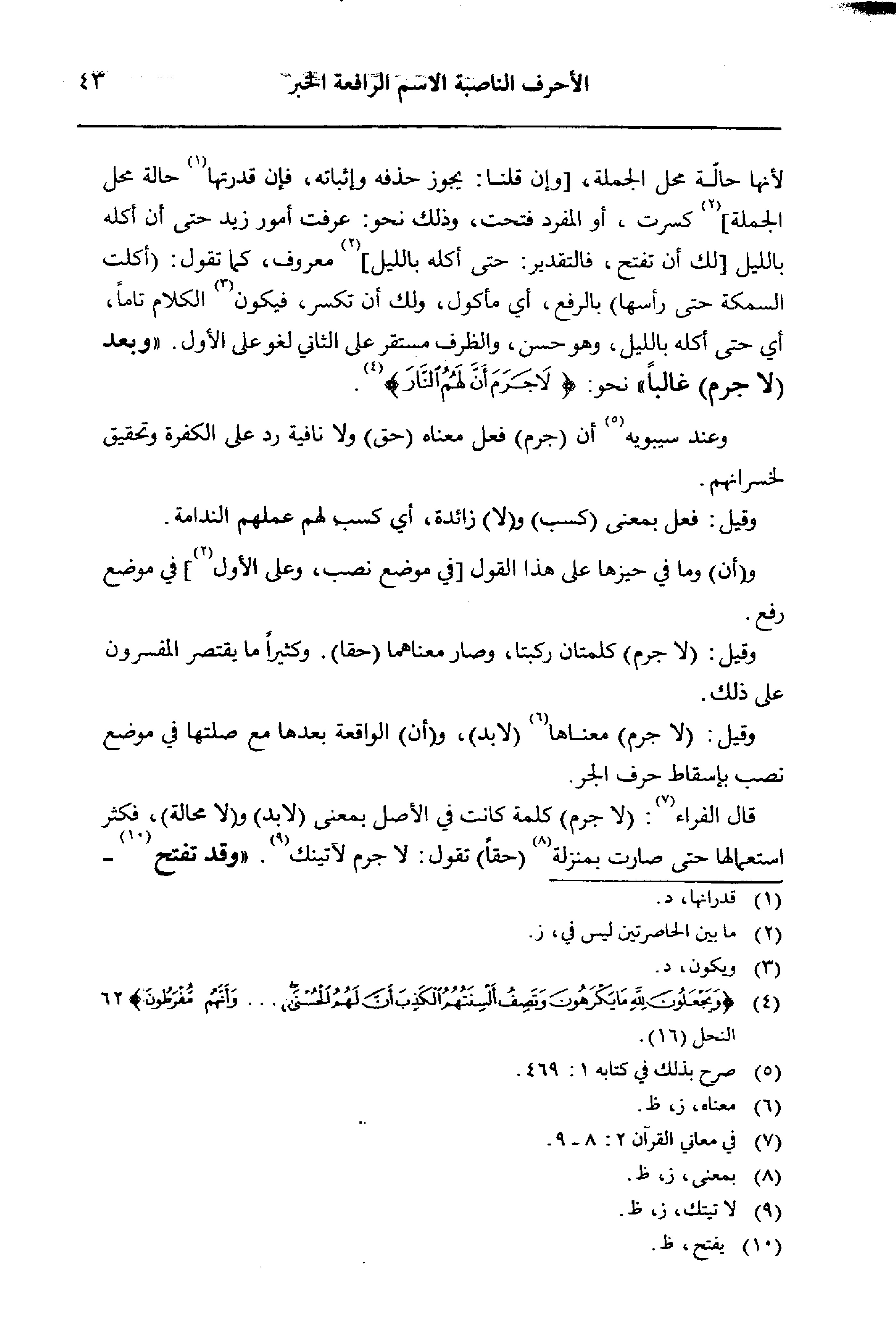 وعند سيبويه أن (جرم) فعل معناه (حق) ولا نافية رد على الكفرة وتحقيق لخسرانهم.