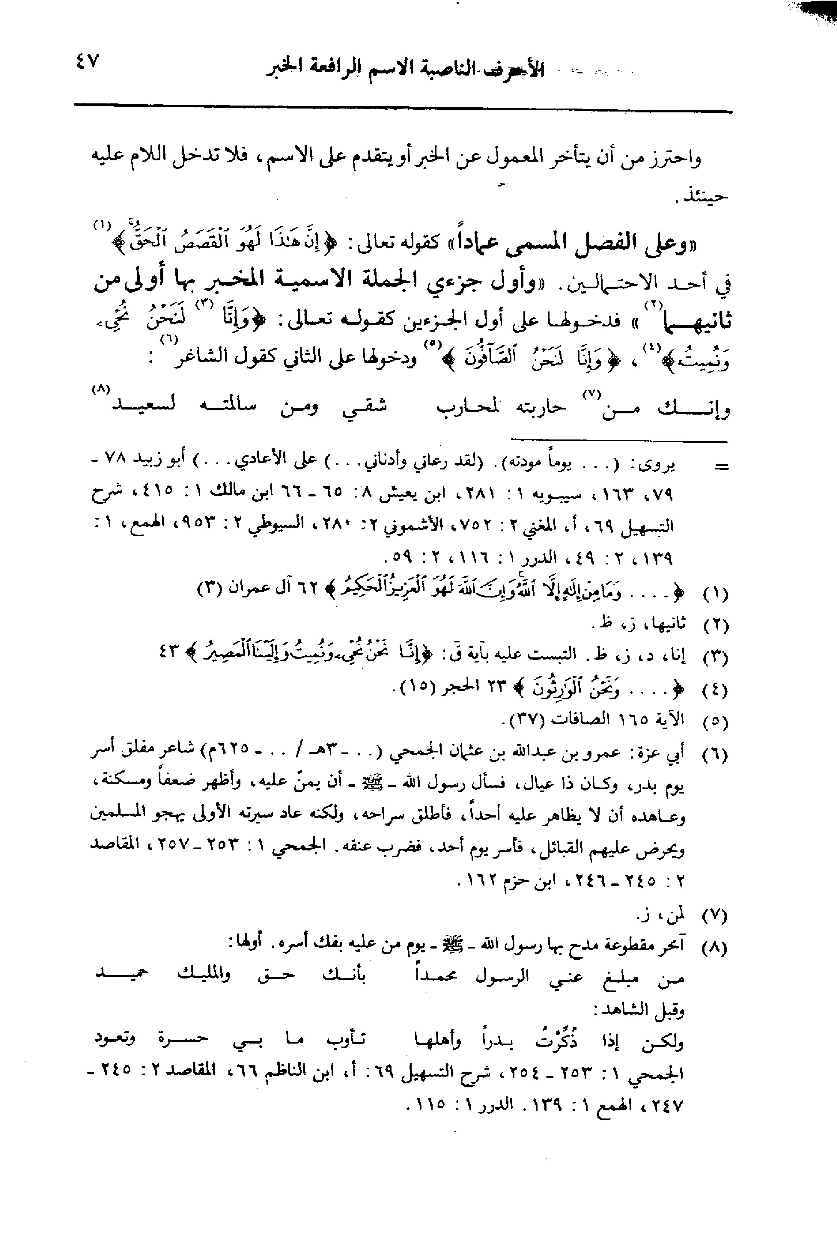 «وعلى الفصل المسمى عمادا» كقوله تعالى: {إِنَّ هَذَا لَهُوَ الْقَصَصُ الْحَقُّ} في أحد الاحتمالين. «وأول جزءي الجملة الاسمية المخبر بها أولى من ثانيهما» فدخلوها على أول الجزءين كقوله تعالى: {وَإِنَّا لَنَحْنُ نُحْيِي وَنُمِيتُ}. {وَإِنَّا لَنَحْنُ الصَّافُّونَ} ودخولها على الثاني كقول الشاعر: