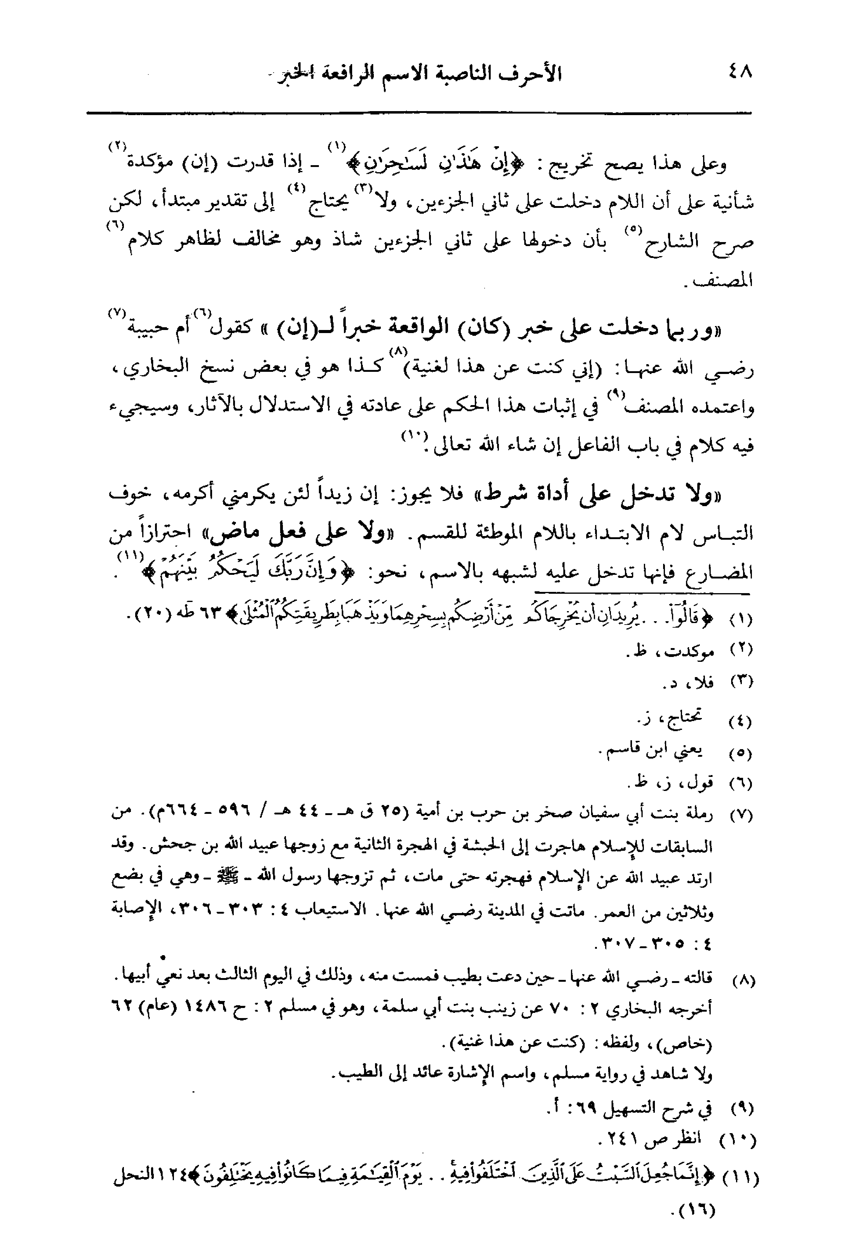 «وربما دخلت على خبر (كان) الواقعة خبرا لـ (إن)» كقول أم حبيبة رضي الله عنها: (إني كنت عن هذا لغنية) كذا هو في بعض نسخ البخاري، واعتمده المصنف في إثبات هذا الحكم على عادته في الاستدلال بالآثار، وسيجيء فيه كلام في باب الفاعل إن شاء الله تعالى.