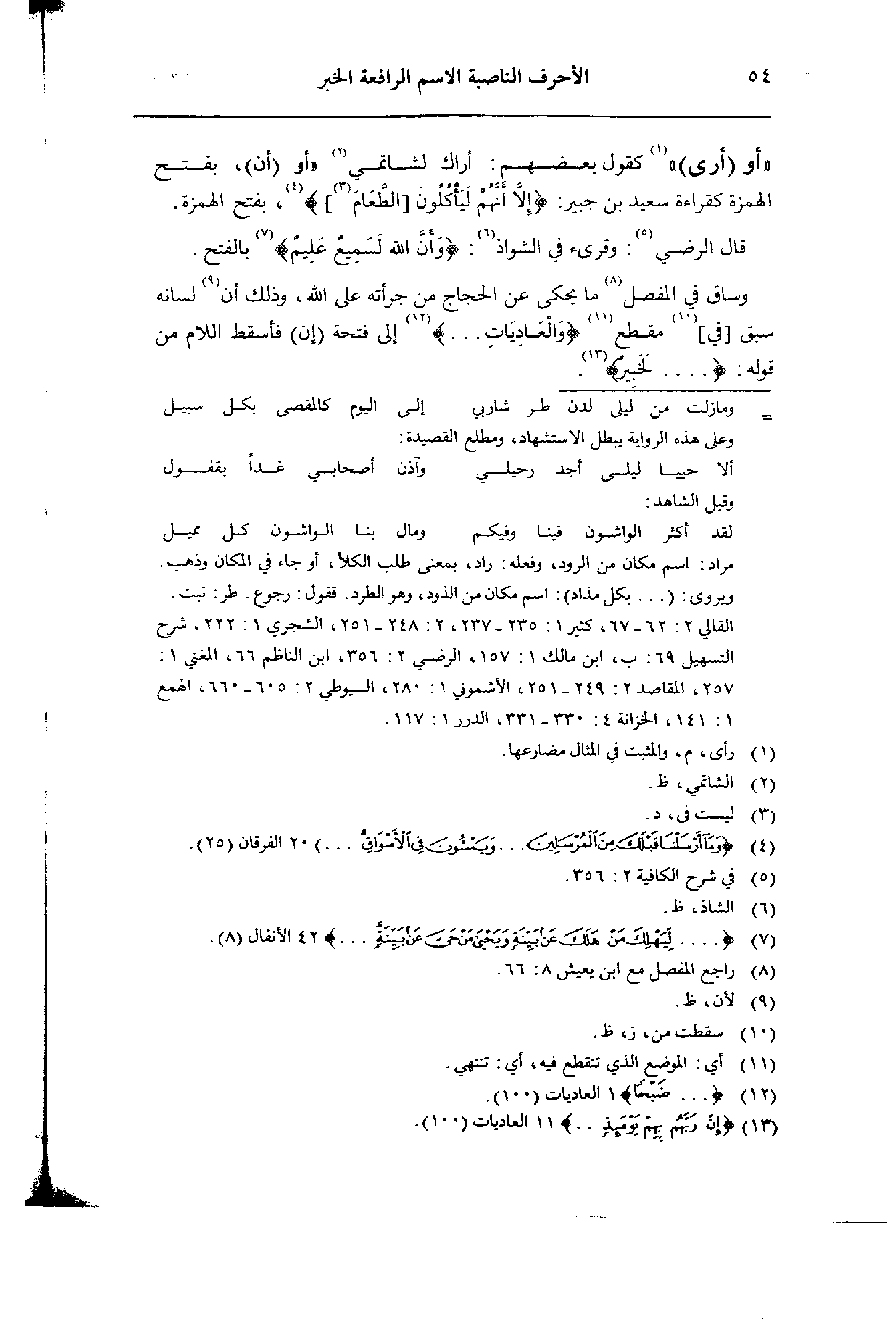 «أو (أرى)» كقول بعضهم: أراك لشاتمي «أو (أن)»، بفتح الهمزة كقراءة سعيد بن جبير: {إِلاَّ أَنَّهُمْ لَيَأْكُلُوونَ [الطَّعَامَ]}، بفتح الهمزة.