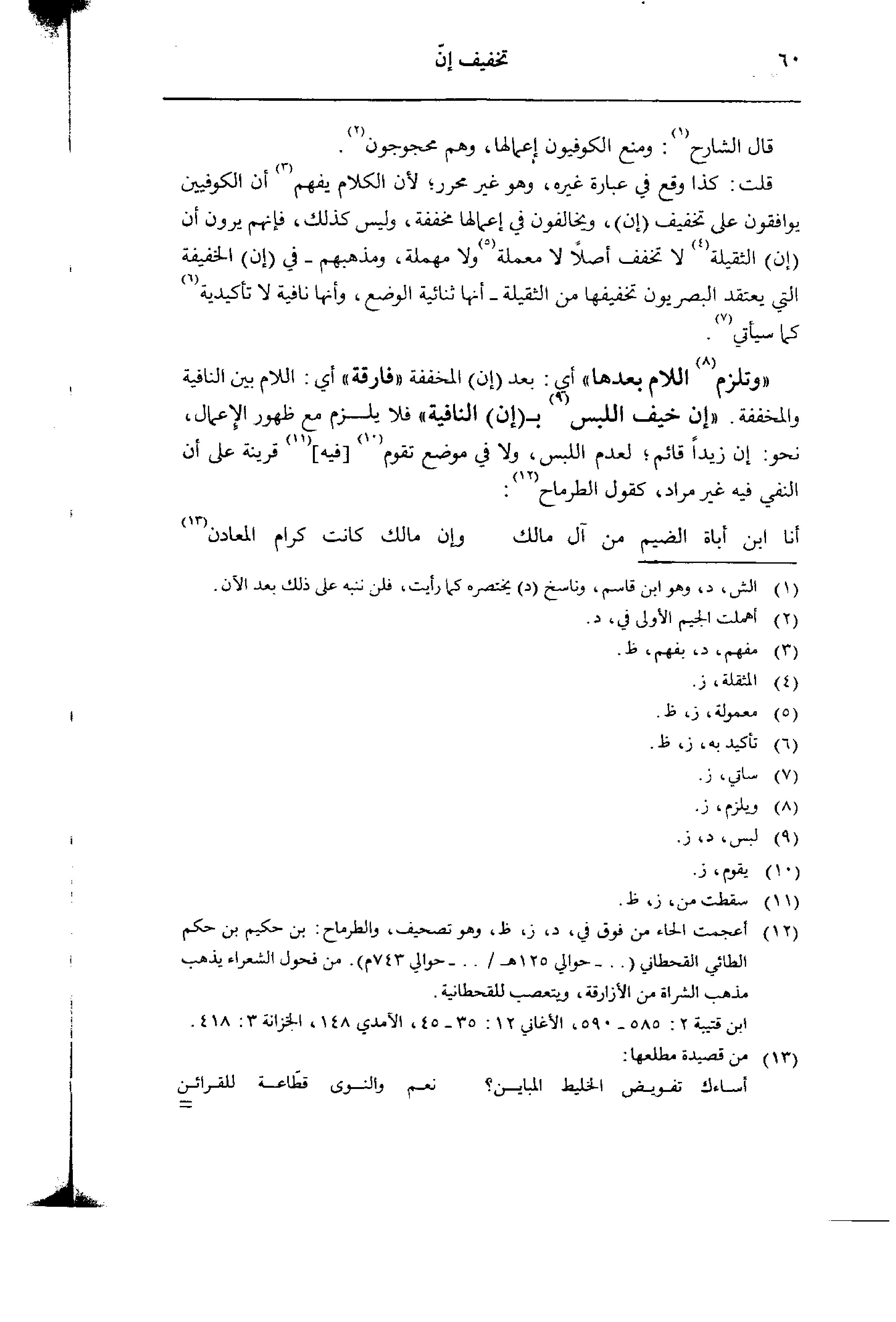 قلن: كذا وقع في عبارة غيره، وهو غير محرر؛ لأن الكلام يفهم أن الكوفيين يوافقون على تخفيف (إن)، ويخالفون في إعمالها مخففة، وليس كذلك، فإنهم يرون أن (إن) الثقيلة لا تخفف أصلا لا معملة ولا مهملة، ومذهبهم- في (إن) الخفيفة التي يعتقد البصريون تخفيفها من الثقيلة- أنها ثنائية الوضع، وأنها نافية لا تأكيدية كما سيأتي.