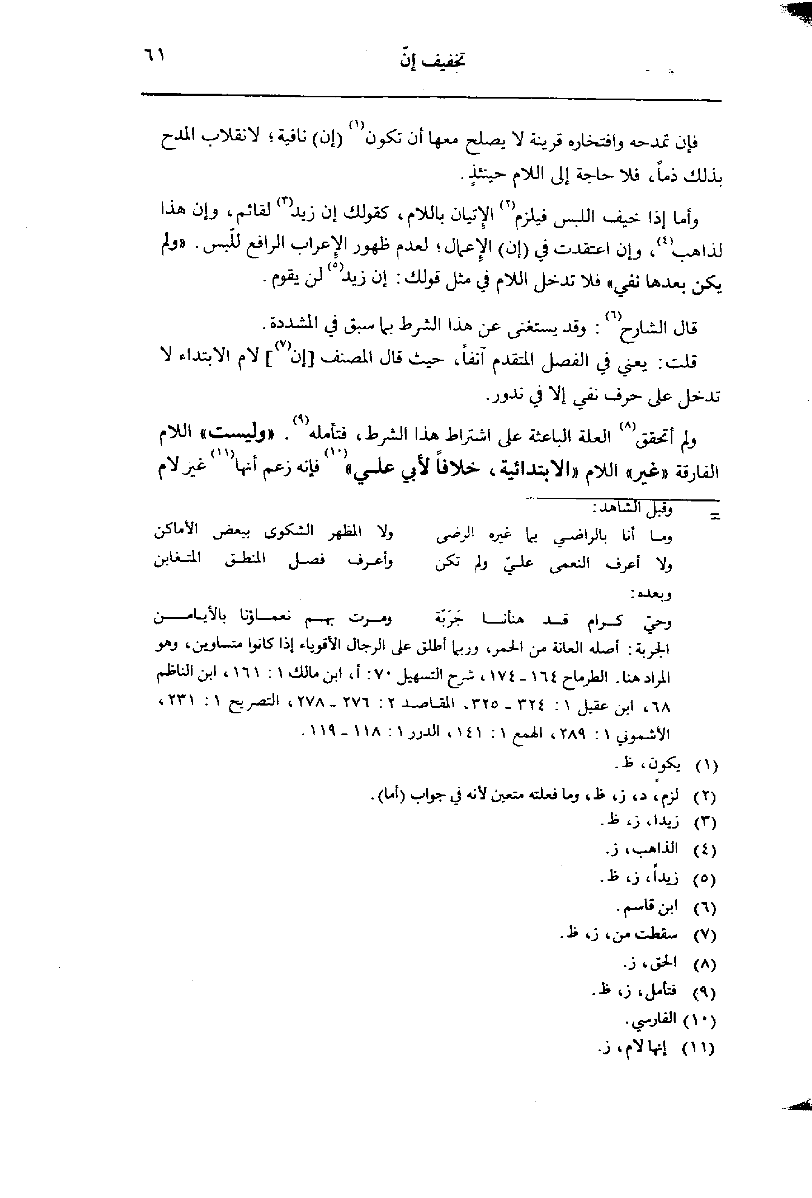 ولم أتحقق العلة الباعثة على اشتراط هذا الشرط، فتأمله. «زليست» اللام الفارقة «غير» اللام «الابتدائية، خلافا لأبي علي» فإنه زعم أها غير لام