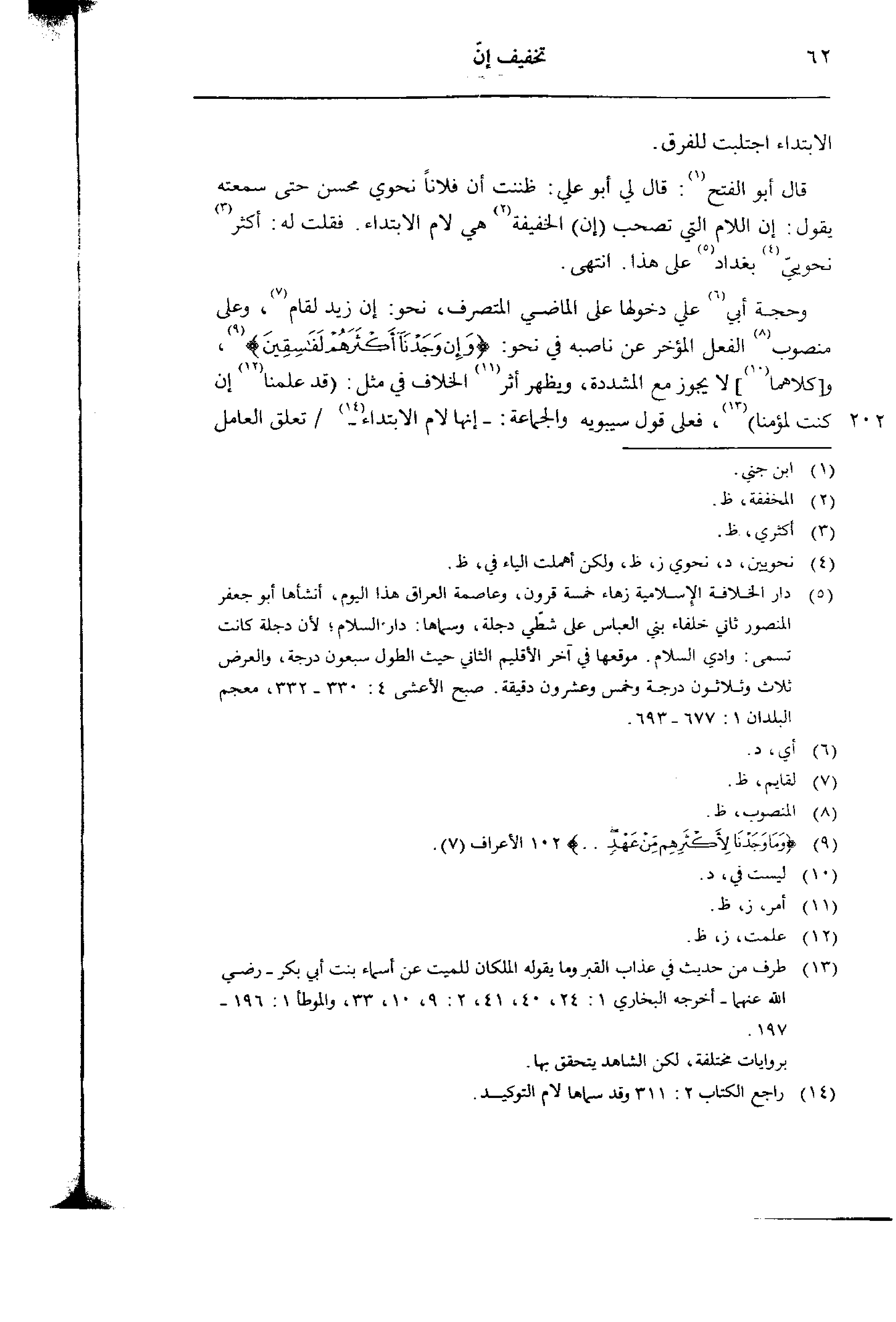 قال أبو الفتح: قال لي أبو علي: ظننت أن فلانا نحوي محسن حتى سمعته يقول: إن اللام التي تصحب (إن) الخفيفة هي لام الابتداء. فقلت له: أكثر نحويي بغداد على هذا. انتهى.