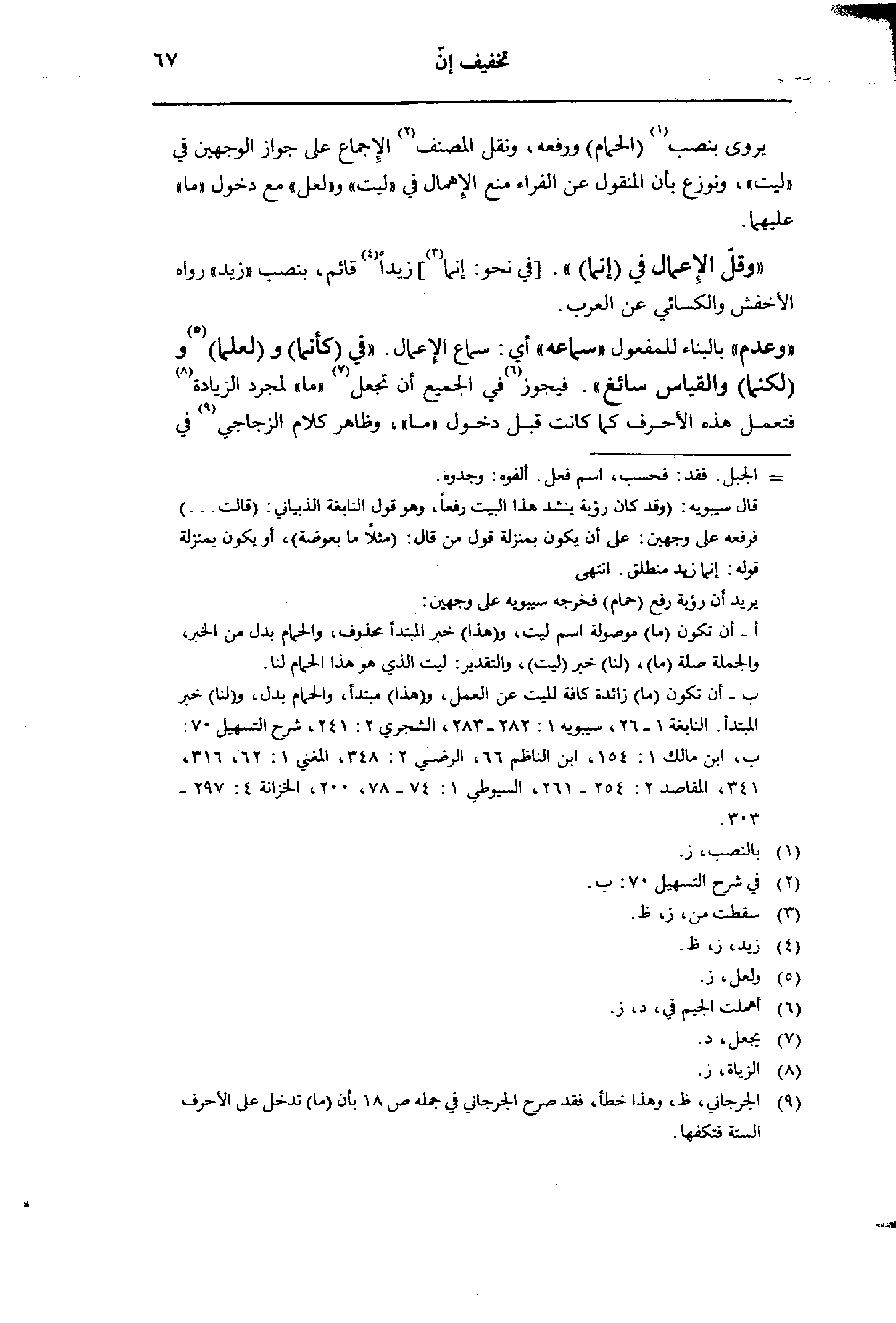 «وقل الإعمال في (إنما)». [في نحو: إنما] زيدا قائم، بنصب «زيد» رواه الأخفش والكسائي عن العرب.