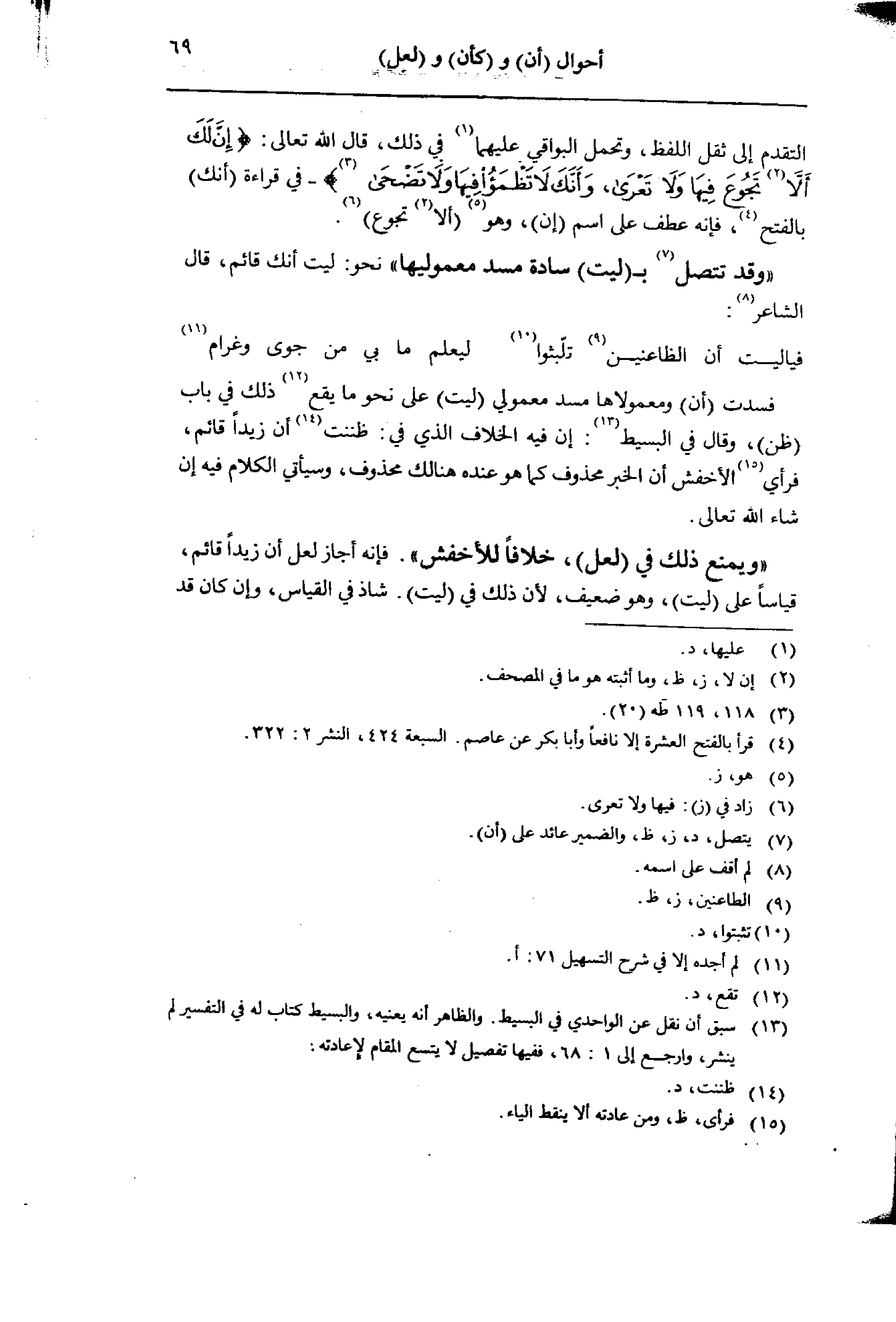 «وقد تتصل بـ (ليت) سادة مسد معموليها» نحو: ليت أنك قائم، قال الشاعر:
