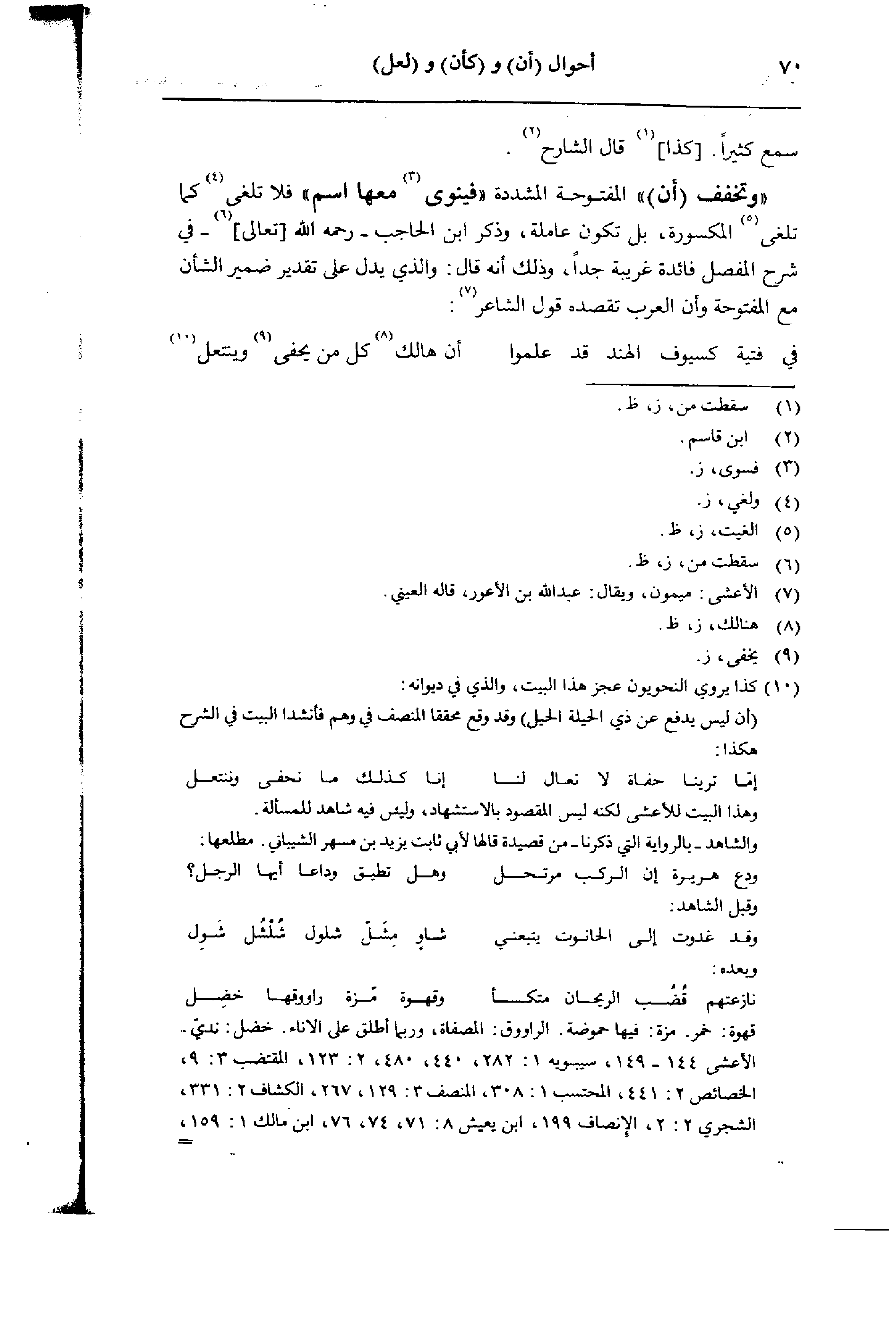 «وتخفف (أن)» المفتوحة المشددة «فينوى معها اسم» فلا تلغى كما تلغى المكسورة، بل تكون عاملة، وذكر ابن الحاجب- رحمه الله [تعالى]- في شرح المفصل فائدة غريبة جدا، وذلك أنه قال: والذي يدل على تقدير ضمير الشأن مع المفتوحة وأن العرب تقصده قول الشاعر: