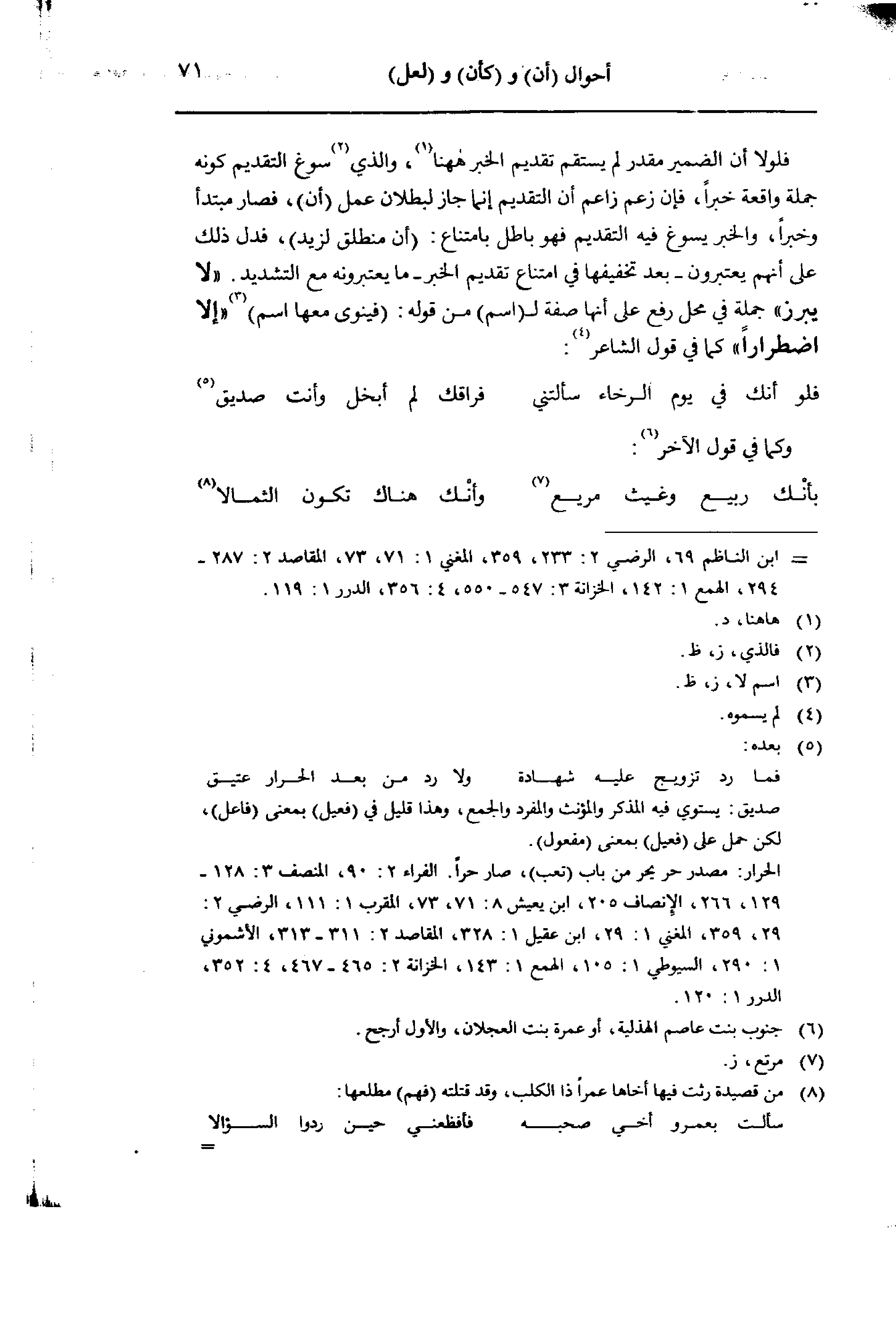 فلولا أن الضمير مقدر لم يستقم تقديم الخبر ههنا، والذي سوغ التقديم كونه جملة واقعة خبرا، فإن زعم زاعم أن التقديم إنما جاز لبطلان عمل (أن)، فصار مبتدأ وخبرا، والخبر يسوغ فيه التقديم فهو باطل بامتناع: (أن منطلق لزيد)، فدل ذلك على أنهم يعتبرون- بعد تخفيفها في امتناع تقديم الخبر- ما يعتبرونه مع التشديد. «لا تضطرارا» كما في قول الشاعر: