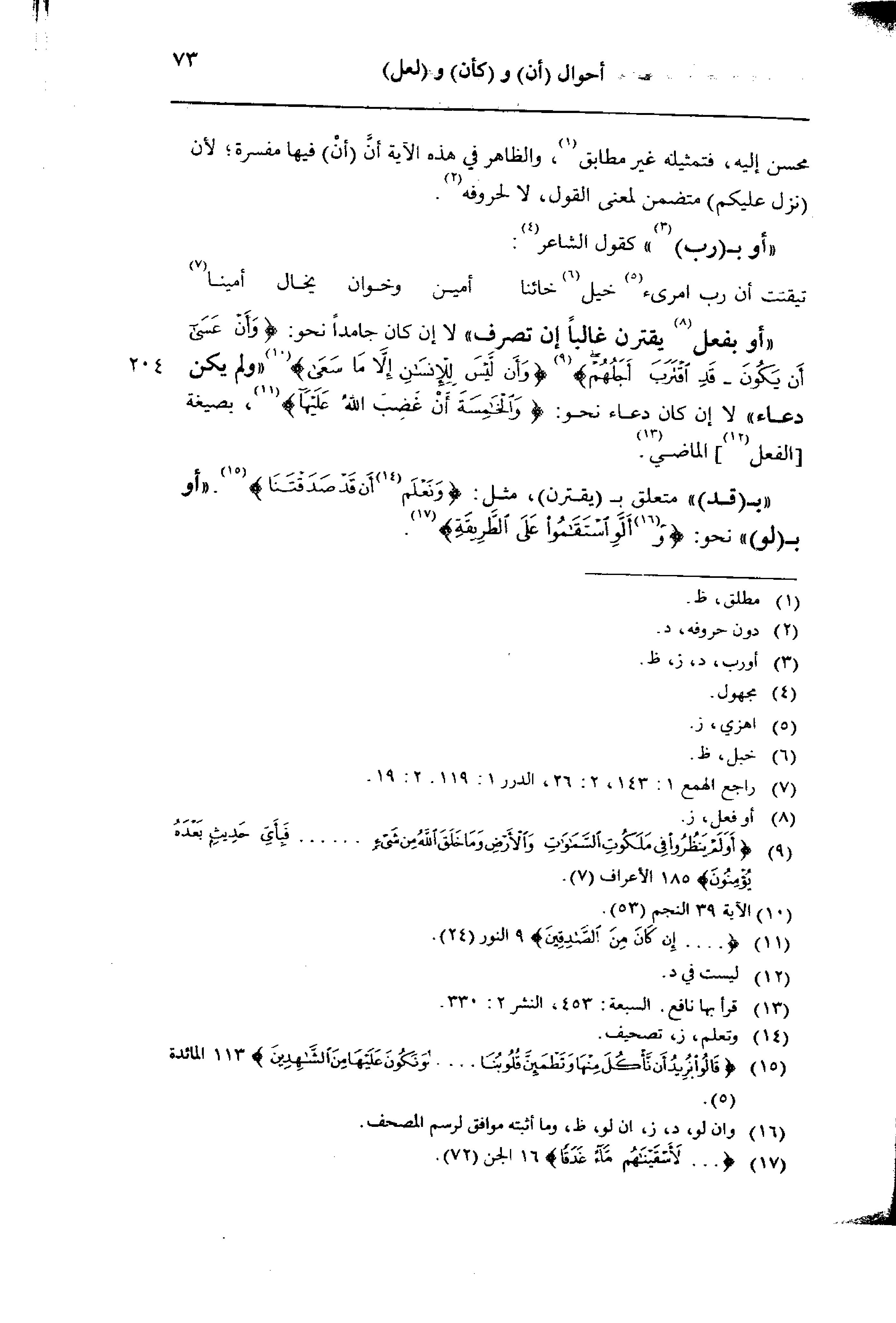 «بـ (قد)» متعلق بـ (يقترن)، مثل: {وَنَعْلَمَ أَنْ قَدْ صَدَقْتَنَا}. «أو ب، (لو)» نحو {وَأَلَّوِ اسْتَقَامُوا عَلَى الطَّرِيقَةِ}.