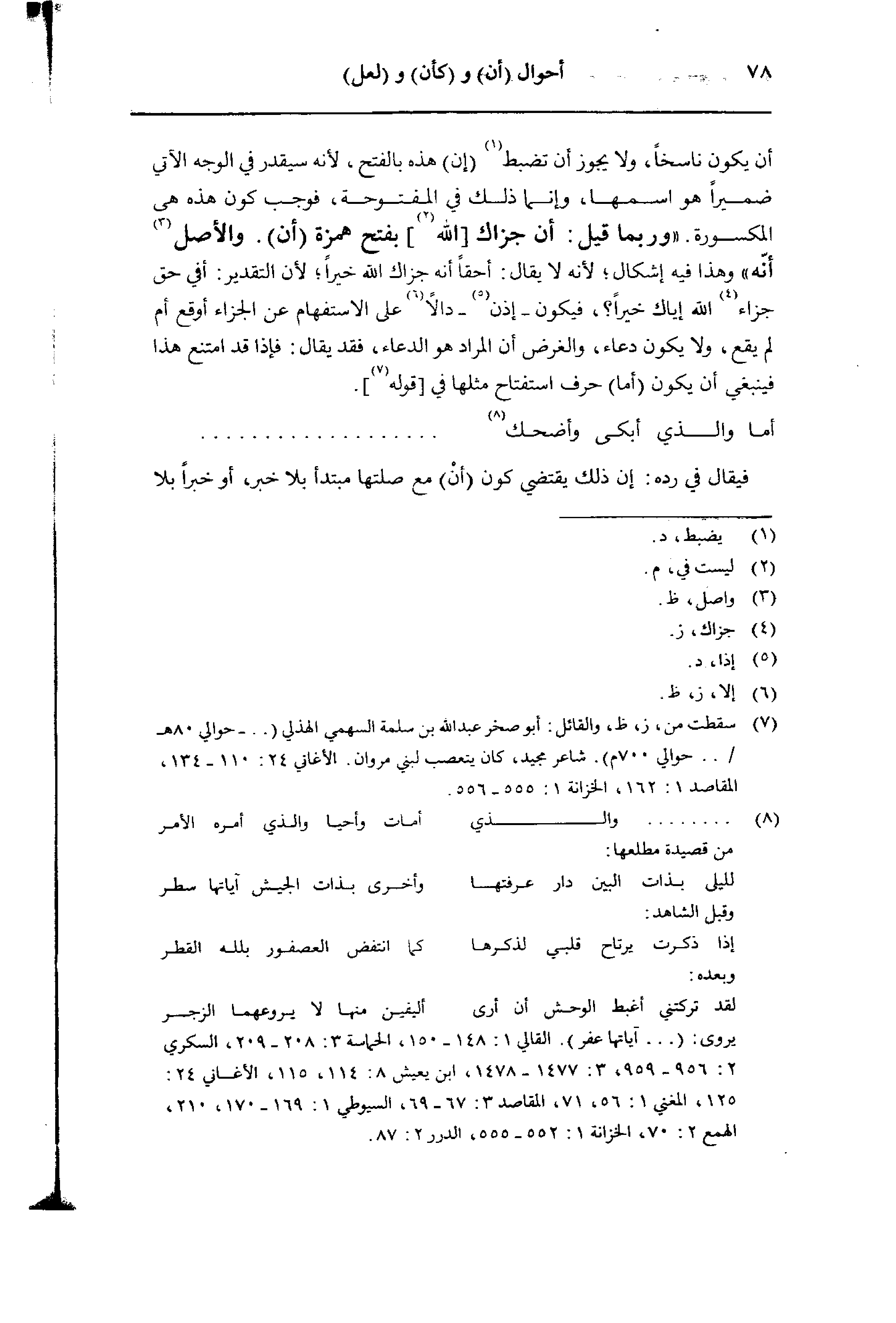 أن يكون ناسخا، ولا يجوز أن تضبط (إن) هذه بالفتح، لأنه سيقدر في الوجه الآتي ضميرا هو اسمها، وإنما ذلك في المفتوحة، فوجب كون هذه هي المكسورة. «وربما قيل: أن جزاك [الله] بفتح همزة (أن). والأصل أنه» وهذا فيه إشكال؛ لأنه لا يقال: أحقا أنه جزاك الله خيرا؛ لأن التقدير: أفي حق جزاء الله إياك خيرا؟ ، فيكون- إذن- دالا على الاستفهام عن الجزاء أوقع أم لم يقع، ولا يكون دعاء، والغرض أن المراد هو الدعاء، فقد يقال: فإذا قد امتنع هذا فينبغي أن يكون (أما) حرف استفتاح مثلها في [قوله].