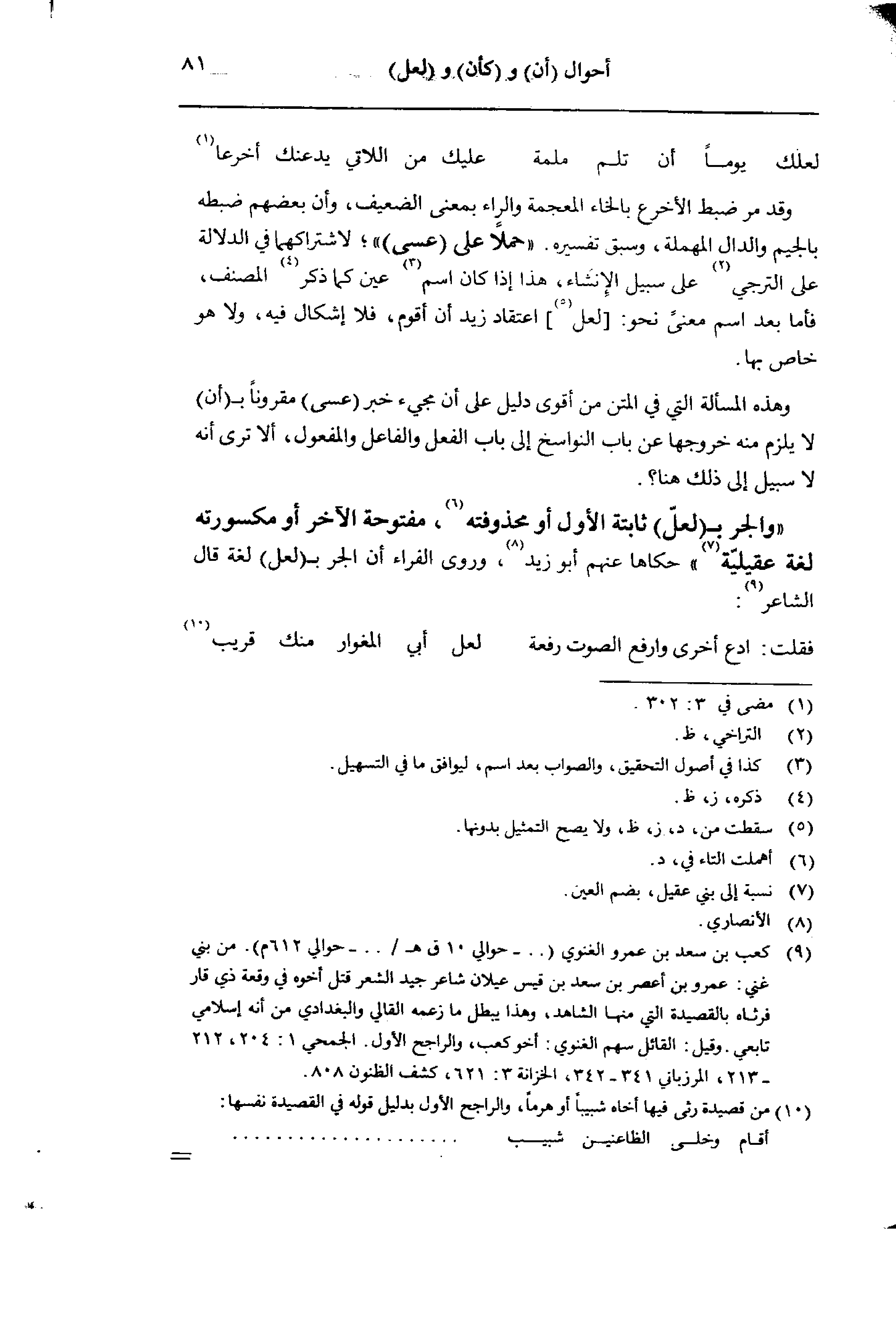 «والجر بـ (لعل) ثابتة الأول أو محذوفته، مفتوحة الآخر أو مكسورته لغة عقيلية» حكاها عنهم أبو زيد، وروى الفراء أن الجر بـ (لعل) لغة قال الشاعر: