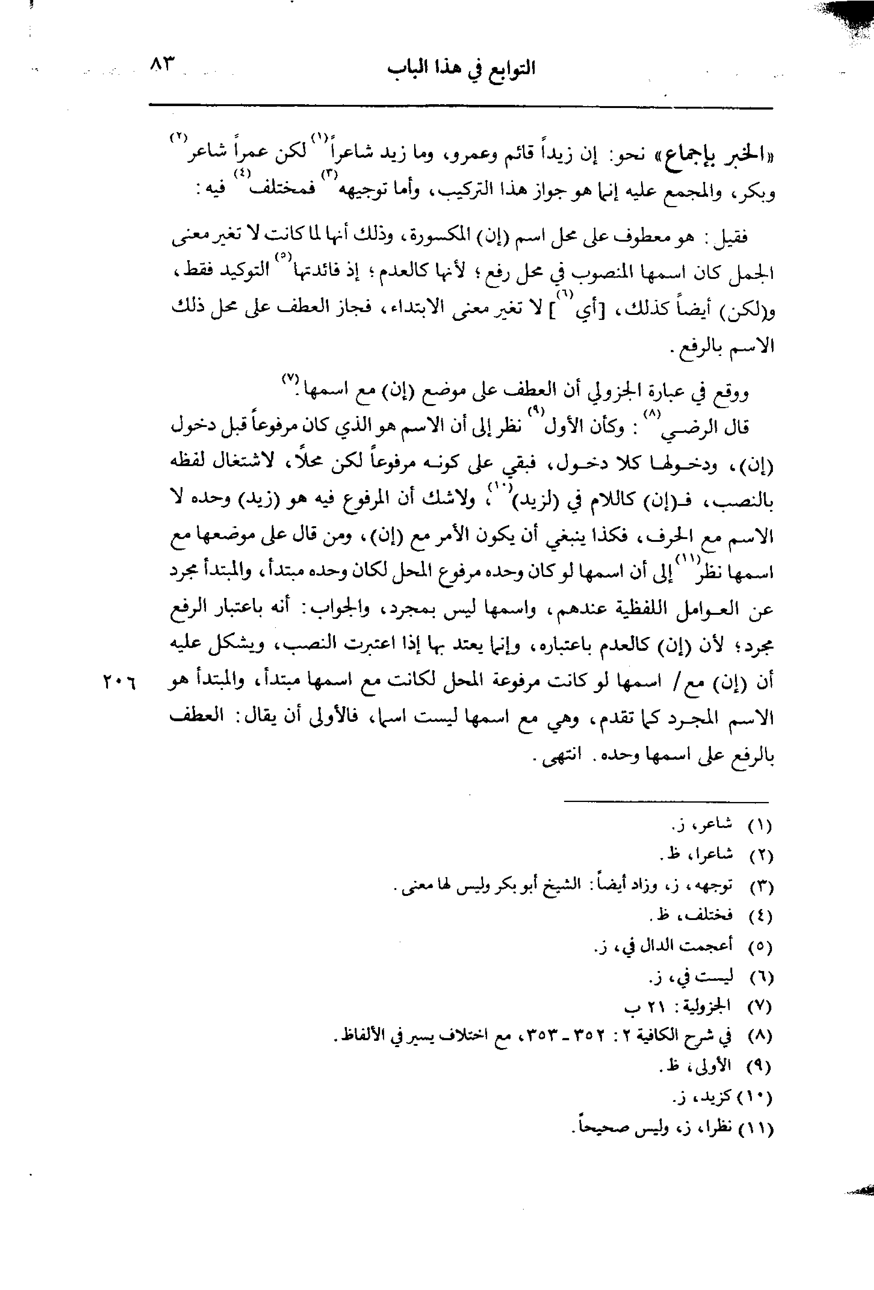 قال الرضي: وكأن الأول نظر إلى أن الاسم هو الذي كان مرفوعا قبل دخول (إن)، ودخولها كلا دخول، فبقي على كونه مرفوعا لكن محلا، لاشتغال لفظه بالنصب، فـ (إن) كاللام في (لزيد)، ولا شك أن المرفوع فيه هو (زيد) وحده لا الاسم مع الحرف، فكذا ينبغي أن يكون الأمر مع (إن)، ومن قال على موضعها مع اسنها نظر إلى أن اسمها لو كان وحده مرفوع المحل لكان وحده ميتدأ، والمبتدأ مجرد عن العوامل اللفظية عندهم، واسممها ليس بمجرد، والجواب: أنه باعتبار الرفع مجرد؛ لأن (إن) كالعدم باعتباره، وإنما يعتد بها إذا اعتبرت النصب، ويشكل عليه أن (إن) مع/اسمها لو كانت مرفوعة المحل لكانت مع اسمها مبتدأ، والمبتدأ هو الاسم المجرد كما تقدم، وهي مع اسمها ليست اسما، فالأولى أن يقال: العطف بالرفع على اسمها وحده. انتهى.