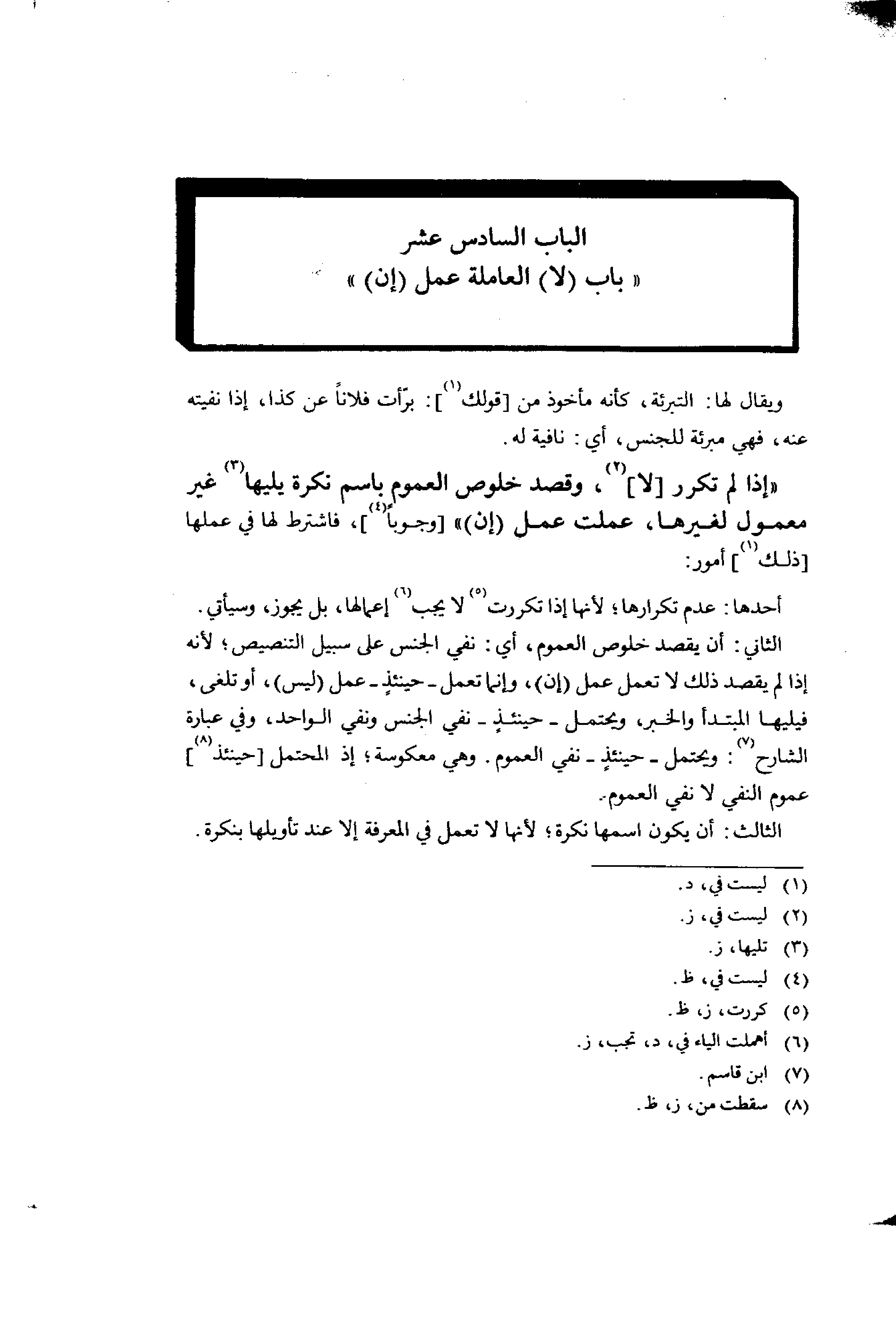 الثاني: أن يقصد خلوص العموم، أي: نفي الجنس على سبيل التنصيص؛ لأنه إذا لم يقصد ذلك لا تعمل عمل (إن)، وإنما تعمل- حينئذ- عمل (ليس)، أو تلغى، فيليها المبتدأ والخبر، ويحتمل- حينئ- نفي الجنس ونفي الواحد، وفي عبارة الشارح: ويحتمل- حينئذ- نفي العموم. وهي معكوسة؛ إذ المحتمل [حينئذ] عموم النفي لا نفي العموم.