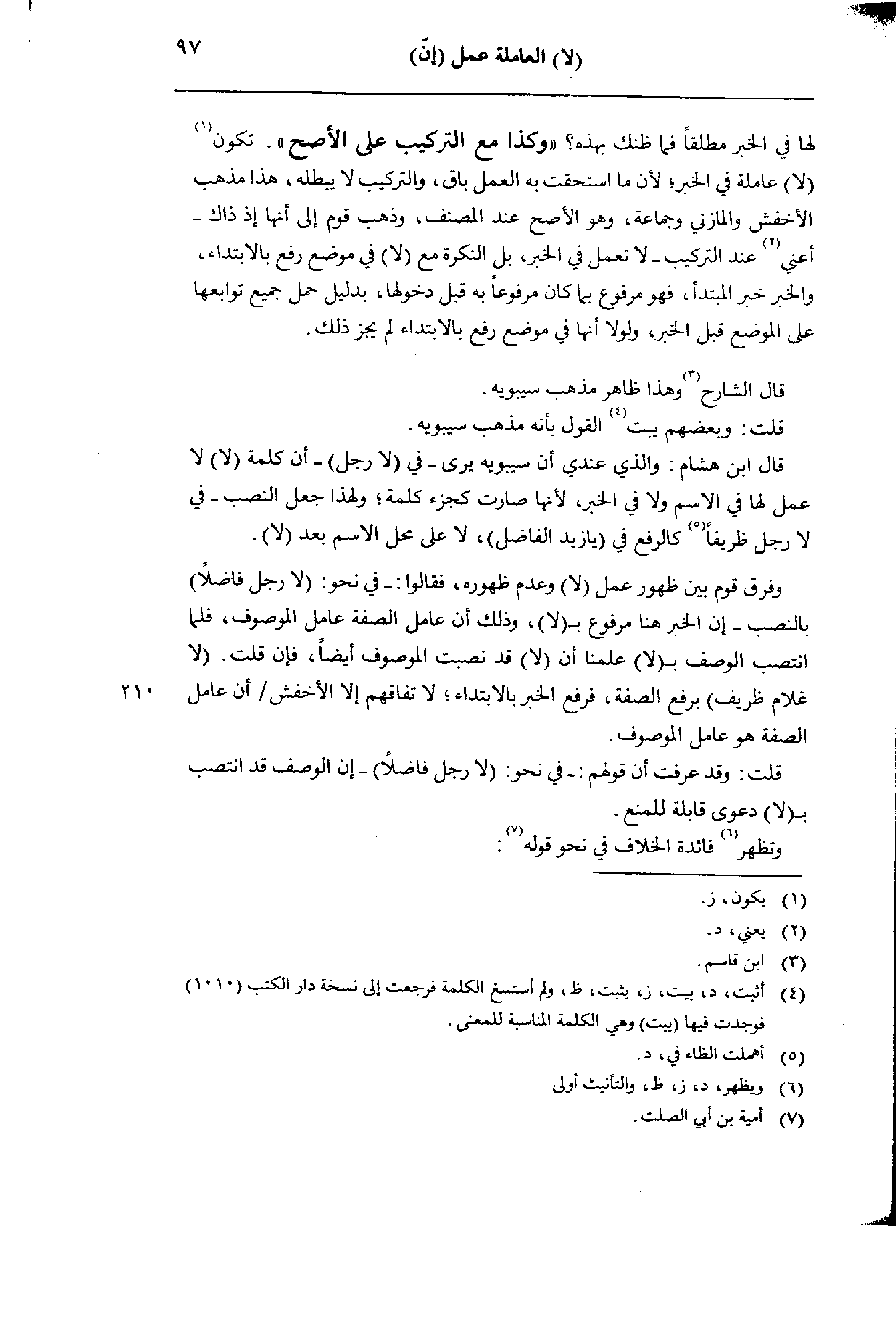 قال ابن هشام: والذي عندي أن سيبويه يرى- في (لا رجل) - أن كلمة (لا) لا عمل لها في الاسم ولا في الخبر، لأنها صارت كجزء كلمة؛ ولهذا جعل النصب- في لا رجل ظريفا كالرفع في (يا زيد الفاضل)، لا على نحل الاسم بعد (لا).