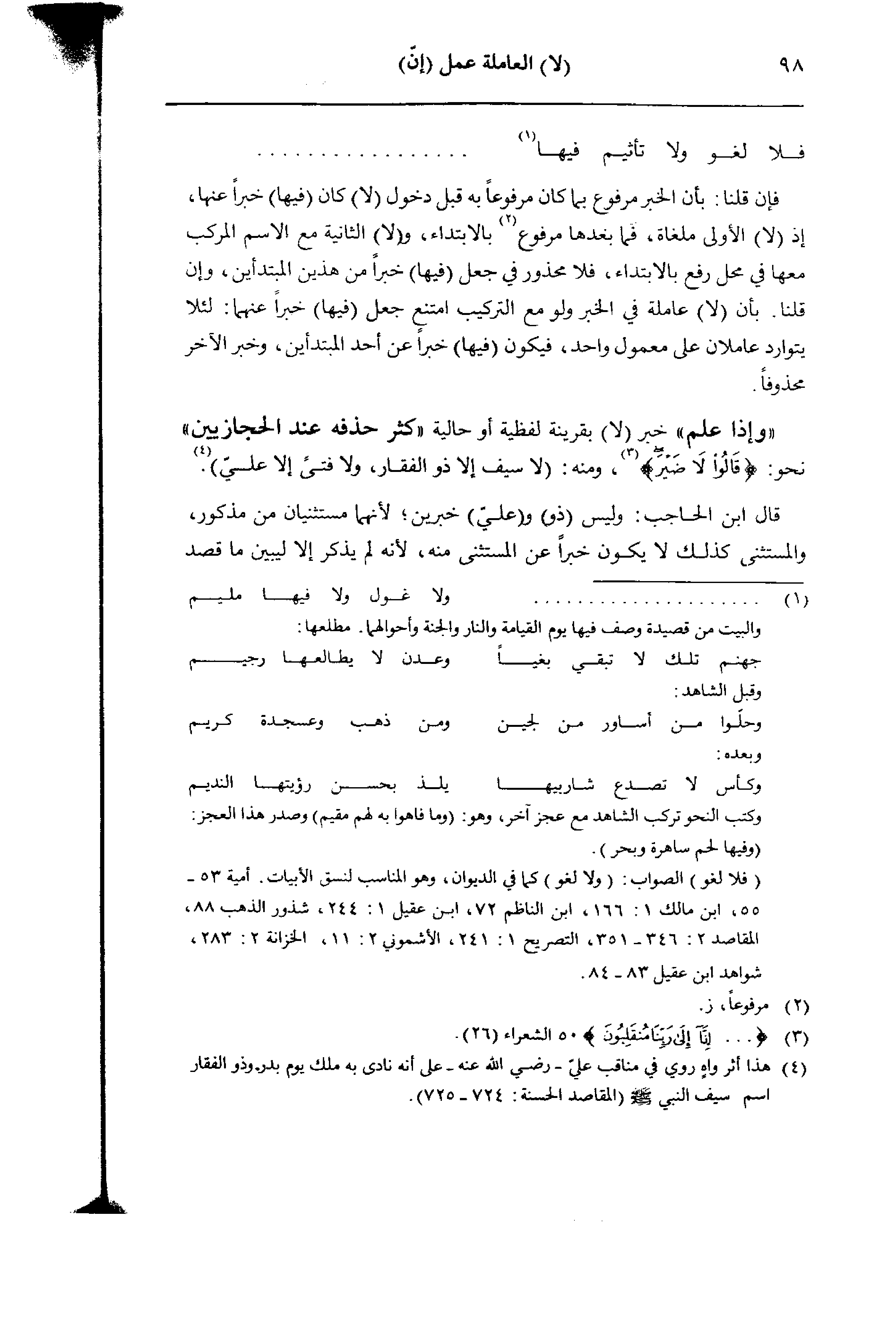 «وإذا علم» خبر (لا) بقرينه لفظية أو حالية «كثر حذفه عند الحجازيين» نحو: {قَالُوا لا ضَيْرَ} / ومنه: (لا سيف إلا ذو الفقار، ولا فتى إلا علي).
