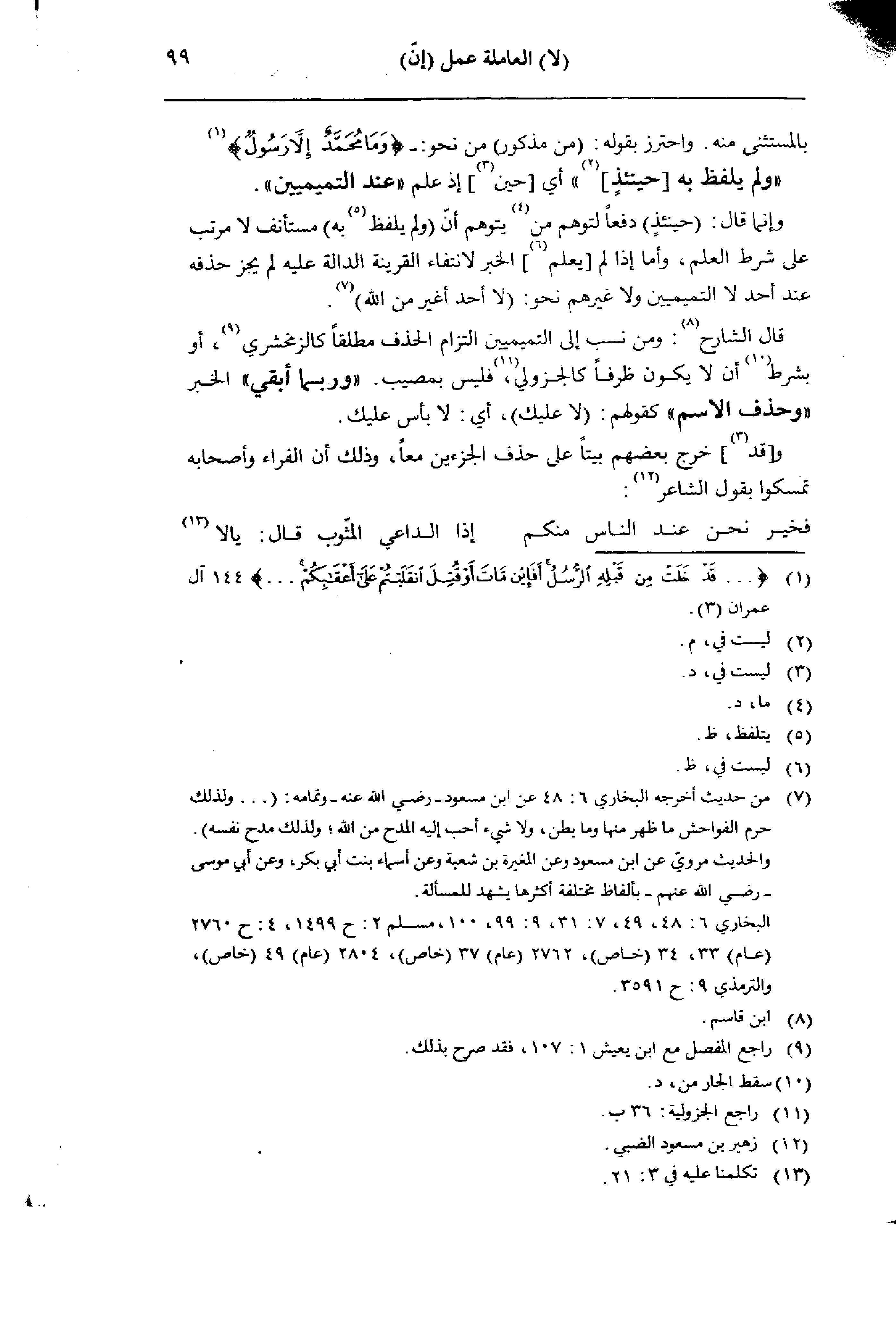 قال الشارح: ومن نسب إلى التميميين التزام الحذف مطلقا كالزمخشري، أو بشرط أن لا يكون ظرفا كالجزولي، فبيس بمصيب. «وربما أبقى» الخبر «وحذف الاسم» كقولهم: (لا عليك)، أي: لا بأس علعيك.