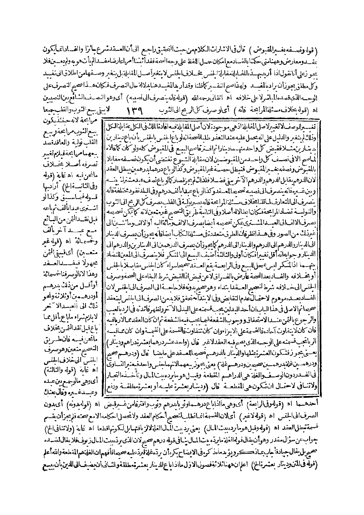 وَلَوْ كَانَ كَمَا قَالَاهُ لَمَا صَحَّ إلَّا فِي نِصْفِ كُلِّ وَاحِدٍ مِنْ الْمَقْبُوضَيْنِ؛ لِأَنَّ مُقَابَلَةَ الشُّيُوعِ تَقْتَضِي أَنْ يَكُونَ نِصْفُهُ مُقَابَلًا بِالْمَقْبُوضِ وَنِصْفُهُ بِغَيْرِ الْمَقْبُوضِ فَتَبْطُلُ حِصَّةُ غَيْرِ الْمَقْبُوضِ، وَكَذَا لَوْ بَاعَ دِرْهَمًا بِدِرْهَمَيْنِ يَبْطُلُ الْعَقْدُ؛ لِأَنَّ الدِّرْهَمَ يُقَابِلُ الدِّرْهَمَ، وَالدِّرْهَمُ الْآخَرُ يَبْقَى فَضْلًا فَلِذَلِكَ لَمْ يَجُزْ فَصَارَ كَمَا لَوْ بَاعَ نِصْفَ عَبْدٍ مُشْتَرَكٍ بَيْنَهُ وَبَيْنَ غَيْرِهِ فَإِنَّهُ يَنْصَرِفُ إلَى نَصِيبِهِ تَصْحِيحًا لِلْعَقْدِ، وَكَذَا لَوْ بَاعَ عَبْدًا بِأَلْفِ دِرْهَمٍ وَفِي الْبَلَدِ نُقُودٌ مُخْتَلِفَةٌ فَإِنَّهُ يَنْصَرِفُ إلَى الْمُتَعَارَفِ لِمَا قُلْنَا بِخِلَافِ مَسْأَلَةِ الْمُرَابَحَةِ فَإِنَّهُ يَصِيرُ تَوْلِيَةً فِي الْقَلْبِ بِصَرْفِ كُلِّ الرِّبْحِ إلَى الثَّوْبِ، وَالتَّوْلِيَةُ تُضَادُّ الْمُرَابَحَةَ فَكَانَ إبْطَالًا لَهُ أَصْلًا وَفِي الثَّانِيَةِ طَرِيقُ التَّصْحِيحِ غَيْرُ مُتَعَيِّنٍ؛ لِأَنَّهُ كَمَا يُمْكِنُ تَصْحِيحُهُ بِصَرْفِ الْأَلْفِ إلَى الْعَبْدِ الْمُشْتَرَى يُمْكِنُ تَصْحِيحُهُ أَيْضًا بِصَرْفِ الْأَلْفِ وَمِائَةٍ إلَيْهِ، أَوْ الْأَلْفِ وَمِائَتَيْنِ إلَى غَيْرِ ذَلِكَ مِنْ الصُّوَرِ وَفِي هَذَا نَظَرٌ فَإِنَّ الطُّرُقَ مُتَعَدِّدَةٌ فِي مَسْأَلَةِ الْكِتَابِ أَيْضًا فَإِنَّهُ يَجُوزُ أَنْ يَصْرِفَ الدِّينَارَ إلَى الدِّينَارِ، وَالدِّرْهَمَ إلَى الدِّرْهَمِ، وَالدِّينَارَ إلَى الدِّرْهَمِ كَمَا يَجُوزُ أَنْ يَصْرِفَ الدِّرْهَمَيْنِ إلَى الدِّينَارَيْنِ، وَالدِّرْهَمَ إلَى الدِّينَارِ وَجَوَابُهُ أَنَّهُ أَقَلُّ تَغْيِيرًا فَكَانَ، أَوْلَى.