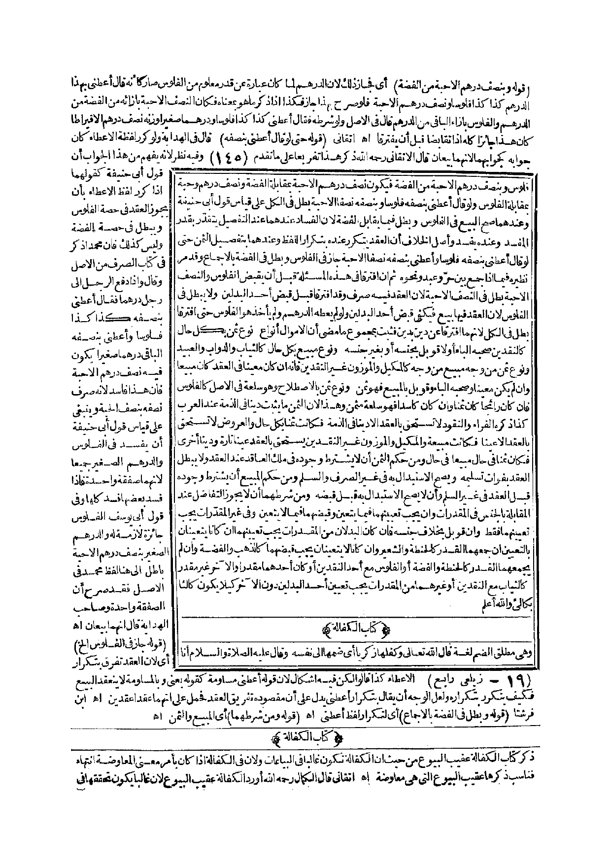 فُلُوسٍ وَبِنِصْفِ دِرْهَمٍ إلَّا حَبَّةً مِنْ الْفِضَّةِ فَيَكُونُ نِصْفَ دِرْهَمٍ إلَّا حَبَّةً بِمُقَابَلَةِ الْفِضَّةِ وَنِصْفَ دِرْهَمٍ وَحَبَّةٍ بِمُقَابَلَةِ الْفُلُوسِ وَلَوْ قَالَ أَعْطِنِي بِنِصْفِهِ فُلُوسًا وَبِنِصْفِهِ نِصْفًا إلَّا حَبَّةً بَطَلَ فِي الْكُلِّ عَلَى قِيَاسِ قَوْلِ أَبِي حَنِيفَةَ وَعِنْدَهُمَا صَحَّ الْبَيْعُ فِي الْفُلُوسِ وَبَطَلَ فِيمَا يُقَابِلُ الْفِضَّةَ؛ لِأَنَّ الْفَسَادَ عِنْدَهُمَا عِنْدَ التَّفْصِيلِ يَتَقَدَّرُ بِقَدْرِ الْمُفْسِدِ وَعِنْدَهُ يَفْسُدُ وَأَصْلُ الْخِلَافِ أَنَّ الْعَقْدَ يَتَكَرَّرُ عِنْدَهُ بِتَكْرَارِ اللَّفْظِ وَعِنْدَهُمَا بِتَفْصِيلِ الثَّمَنِ حَتَّى لَوْ قَالَ أَعْطِنِي بِنِصْفِهِ فُلُوسًا وَأَعْطِنِي بِنِصْفِهِ نِصْفًا إلَّا حَبَّةً جَازَ فِي الْفُلُوسِ وَبَطَلَ فِي الْفِضَّةِ بِالْإِجْمَاعِ وَقَدْ مَرَّ نَظِيرُهُ فِيمَا إذَا جَمَعَ بَيْنَ حُرٍّ وَعَبْدٍ وَنَحْوُهُ، ثُمَّ إنْ افْتَرَقَا فِي هَذِهِ الْمَسْأَلَةِ قَبْلَ أَنْ يَقْبِضَ الْفُلُوسَ وَالنِّصْفَ إلَّا حَبَّةً بَطَلَ فِي النِّصْفِ إلَّا حَبَّةً؛ لِأَنَّ الْعَقْدَ فِيهِ صَرْفٌ وَقَدْ افْتَرَقَا قَبْلَ قَبْضِ أَحَدِ الْبَدَلَيْنِ.