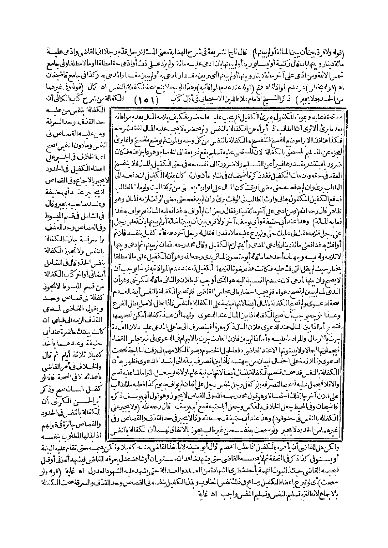 قَالَ - رَحِمَهُ اللَّهُ - (وَلَا يُجْبَرُ عَلَى الْكَفَالَةِ بِالنَّفْسِ فِي حَدٍّ وَقَوَدٍ)، وَهَذَا عِنْدَ أَبِي حَنِيفَةَ - رَحِمَهُ اللَّهُ - وَقَالَا يُجْبَرُ فِي حَدِّ الْقَذْفِ وَالْقِصَاصِ وَفِي غَيْرِهِمَا مِنْ الْحُدُودِ لَا يُجْبَرُ وَلَوْ سَمَحَتْ بِهِ نَفْسُهُ مِنْ غَيْرِ طَلَبٍ يَجُوزُ بِالِاتِّفَاقِ لَهُمَا أَنَّ الْكَفَالَةَ بِالنَّفْسِ