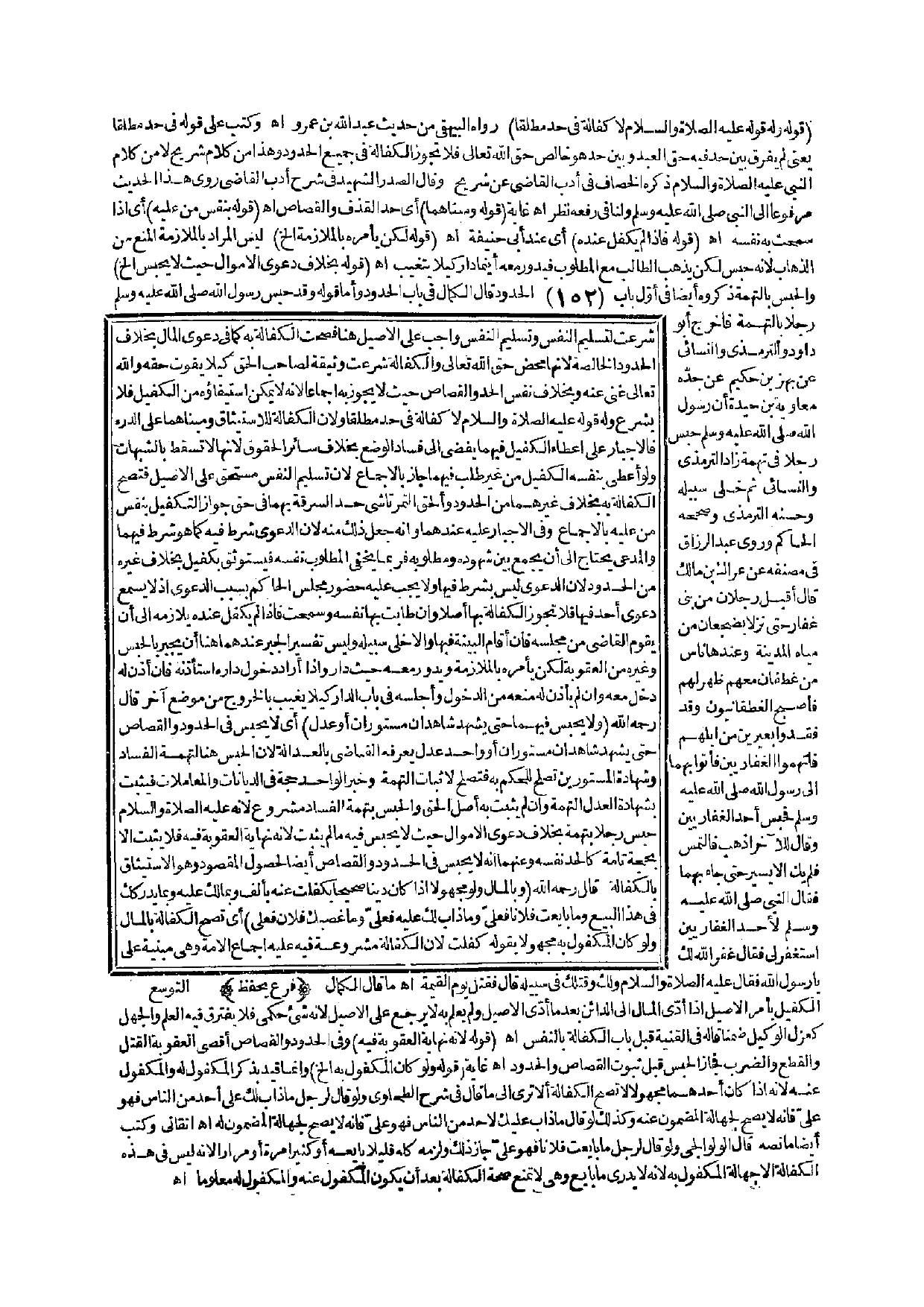 وَكَتَبَ عَلَى قَوْلِهِ فِي حَدٍّ مُطْلَقًا يَعْنِي لَمْ يُفَرِّقْ بَيْنَ حَدٍّ فِيهِ حَقُّ الْعَبْدِ وَبَيْنَ حَدٍّ هُوَ خَالِصُ حَقِّ اللَّهِ تَعَالَى، فَلَا تَجُوزُ الْكَفَالَةُ فِي جَمِيعِ الْحُدُودِ وَهَذَا مِنْ كَلَامِ شُرَيْحٍ لَا مِنْ كَلَامِ النَّبِيِّ - عَلَيْهِ الصَّلَاةُ وَالسَّلَامُ - ذَكَرَهُ الْخَصَّافُ فِي أَدَبِ الْقَاضِي عَنْ شُرَيْحٍ وَقَالَ الصَّدْرُ الشَّهِيدُ فِي شَرْحِ أَدَبِ الْقَاضِي رُوِيَ هَذَا الْحَدِيثُ مَرْفُوعًا إلَى النَّبِيِّ - صَلَّى اللَّهُ عَلَيْهِ وَسَلَّمَ - وَلَنَا فِي رَفْعِهِ نَظَرٌ اهـ.