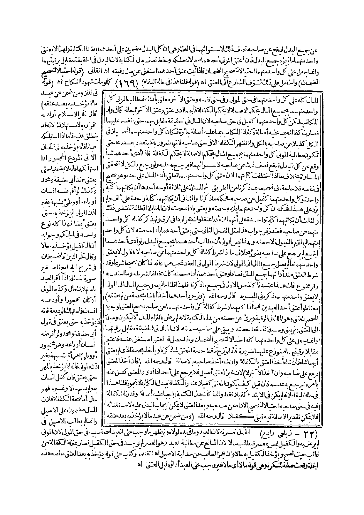 (قَوْلُهُ فِي الْمَتْنِ وَمَنْ ضَمِنَ عَنْ عَبْدٍ مَا لَا يُؤْخَذُ بِهِ بَعْدَ عِتْقِهِ) قَالَ فَخْرُ الْإِسْلَامِ أَرَادَ بِهِ إقْرَارَهُ بِالِاسْتِهْلَاكِ؛ لِأَنَّهُ قَدْ يَنْطَلِقُ عَلَيْهِ فَأَمَّا إذَا اسْتَهْلَكَهُ عِيَانًا فَإِنَّهُ يُؤْخَذُ بِهِ فِي الْحَالِ إلَّا فِي الْمُودَعِ الْمَحْجُورِ إذَا اسْتَهْلَكَهَا فَإِنَّهُ لَا يَضْمَنُهَا حَتَّى يَعْتِقَ عِنْد أَبِي حَنِيفَةَ وَمُحَمَّدٍ، وَكَذَلِكَ لَوْ أَقْرَضَهُ إنْسَانٌ أَوْ بَاعَهُ أَوْ وَطِئَ بِشُبْهَةٍ بِغَيْرِ إذْنِ الْمَوْلَى لَمْ يُؤْخَذْ بِهِ حَتَّى يَعْتِقَ أَيْضًا فَهَذَا كُلُّهُ نَوْعٌ وَاحِدٌ فِي الْحُكْمِ وَجَوَابُهُ أَنَّ الْكَفِيلَ يُؤْخَذُ بِهِ حَالًّا، وَقَالَ فَخْرُ الدِّينِ قَاضِي خَانْ فِي شَرْحِ الْجَامِعِ الصَّغِيرِ صُورَةُ الْمَسْأَلَةِ إذَا أَقَرَّ الْعَبْدُ بِاسْتِهْلَاكِ مَالٍ، وَكَذَّبَهُ الْمَوْلَى أَوْ كَانَ مَحْجُورًا وَأَوْدَعَهُ إنْسَانٌ فَاسْتَهْلَكَ الْوَدِيعَةَ فَإِنَّهُ لَا يُؤْخَذُ بِهِ حَتَّى يَعْتِقَ فِي قَوْلِ أَبِي حَنِيفَةَ وَمُحَمَّدٍ، وَلَوْ أَقْرَضَهُ إنْسَانٌ أَوْ بَاعَهُ، وَهُوَ مَحْجُورٌ أَوْ وَطِئَ امْرَأَةً بِشُبْهَةٍ بِغَيْرِ إذْنِ الْمَوْلَى فَإِنَّهُ لَا يُؤْخَذُ بِالْمَهْرِ حَتَّى يَعْتِقَ فَإِنْ كَفَلَ إنْسَانٌ بِهِ وَلَمْ يُسَمِّ حَالًّا وَغَيْرَهُ فَهُوَ حَالٌّ أَمَّا صِحَّةُ الْكَفَالَةِ فَلِأَنَّ الْمَالَ مَضْمُونٌ عَلَى الْأَصِيلِ، وَإِنَّمَا لَمْ يُطَالَبْ الْأَصِيلُ فِي الْحَالِ لِعُسْرَتِهِ؛ لِأَنَّ الْعَبْدَ وَمَا فِي يَدِهِ لِمَوْلَاهُ وَلَمْ يَظْهَرْ مَا وَجَبَ عَلَى الْعَبْدِ لِصِحَّةِ سَبَبِهِ فِي حَقِّ الْمَوْلَى؛ لِأَنَّ الْمَوْلَى لَمْ يَرْضَ بِهِ وَالْكَفِيلُ لَيْسَ بِمُعْسِرٍ فَيُطَالَبُ حَالًّا؛ لِأَنَّ الْمَانِعَ عَنْ مُطَالَبَةِ الْعَبْدِ وَهُوَ الْعُسْرُ لَمْ يُوجَدْ فِي حَقِّ الْكَفِيلِ، فَصَارَ بِمَنْزِلَةِ الْكَفَالَةِ عَنْ غَائِبٍ حَيْثُ تَصِحُّ وَيُؤْخَذُ الْكَفِيلُ بِهِ حَالًّا وَإِنْ عَجَزَ الطَّالِبُ عَنْ مُطَالَبَةِ الْأَصِيلِ. اهـ. أَتْقَانِيٌّ وَكَتَبَ عَلَى قَوْلِهِ يُؤْخَذُ بِهِ بَعْدَ الْعِتْقِ مَا نَصُّهُ هَذِهِ الْجُمْلَةُ وَقَعَتْ صِفَةً لِلنَّكِرَةِ وَهِيَ قَوْلُهُ مَالًا أَيْ مَالًا غَيْرَ وَاجِبٍ عَلَى الْعَبْدِ أَدَاؤُهُ قَبْلَ الْعِتْقِ اهـ.