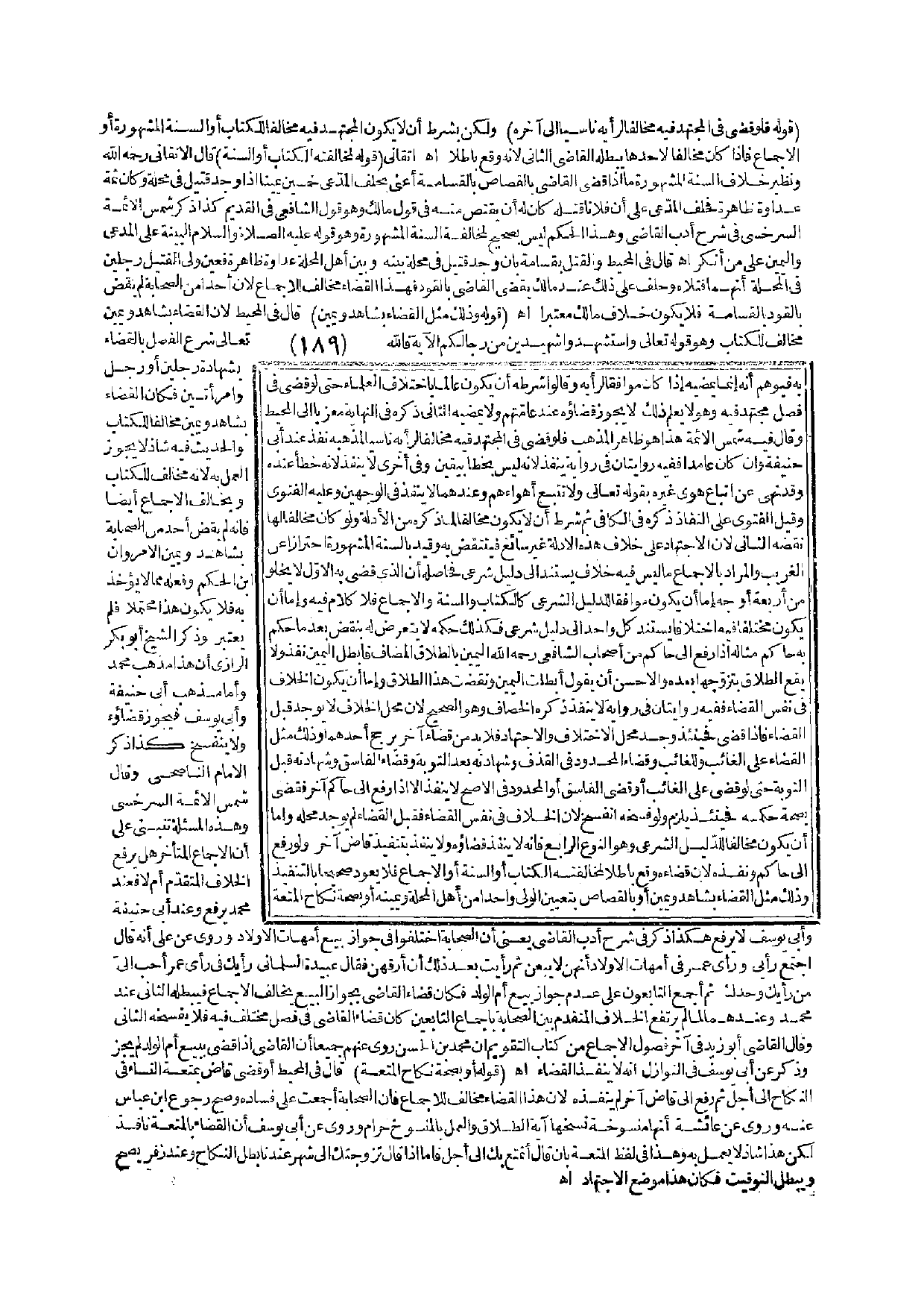 فَاَللَّهُ تَعَالَى شَرَعَ الْفَصْلَ بِالْقَضَاءِ بِشَهَادَةِ رَجُلَيْنِ أَوْ رَجُلٍ وَامْرَأَتَيْنِ فَكَانَ الْقَضَاءُ بِشَاهِدٍ وَيَمِينٍ مُخَالِفًا لِلْكِتَابِ وَالْحَدِيثُ فِيهِ شَاذٌّ لَا يَجُوزُ الْعَمَلُ بِهِ؛ لِأَنَّهُ مُخَالِفٌ لِلْكِتَابِ وَيُخَالِفُ الْإِجْمَاعَ أَيْضًا فَإِنَّهُ لَمْ يَقْضِ عَلَى أَحَدٍ مِنْ الصَّحَابَةِ بِشَاهِدٍ وَيَمِينٍ إلَّا مَرْوَانُ بْنُ الْحَكَمِ وَفِعْلُهُ مِمَّا لَا يُؤْخَذُ بِهِ، فَلَا يَكُونُ هَذَا مُحْتَمَلًا فَلَمْ يُعْتَبَرْ وَذَكَرَ الشَّيْخُ أَبُو بَكْرٍ الرَّازِيّ أَنَّ هَذَا مَذْهَبُ مُحَمَّدٍ، وَأَمَّا مَذْهَبُ أَبِي حَنِيفَةَ وَأَبِي يُوسُفَ فَيَجُوزُ قَضَاؤُهُ وَلَا يَنْفَسِخُ كَذَا ذَكَر الْإِمَامُ النَّاصِحِيُّ وَقَالَ شَمْسُ الْأَئِمَّةِ السَّرَخْسِيُّ وَهَذِهِ الْمَسْأَلَةُ تَنْبَنِي عَلَى أَنَّ الْإِجْمَاعَ الْمُتَأَخِّرَ هَلْ يَرْفَعُ الْخِلَافَ الْمُتَقَدِّمَ أَمْ لَا؟ فَعِنْدَ مُحَمَّدٍ يَرْفَعُ وَعِنْدَ أَبِي حَنِيفَةَ وَأَبِي يُوسُفَ لَا يَرْفَعُ. هَكَذَا ذَكَرَ فِي شَرْحِ أَدَبِ الْقَاضِي يَعْنِي أَنَّ الصَّحَابَةَ اخْتَلَفُوا فِي جَوَازِ بَيْعِ أُمَّهَاتِ الْأَوْلَادِ وَرُوِيَ عَنْ عَلِيٍّ أَنَّهُ قَالَ اجْتَمَعَ رَأْيِي وَرَأْيُ عُمَرَ فِي أُمَّهَاتِ الْأَوْلَادِ أَنَّهُمْ لَا يُبَعْنَ، ثُمَّ رَأَيْت بَعْدَ ذَلِكَ أَنْ أُرِقَّهُنَّ فَقَالَ عَبِيدَةُ السَّلْمَانِيُّ رَأْيُك فِي رَأْيِ عُمَرَ أَحَبُّ إلَيَّ مِنْ رَأْيِك وَحْدَك، ثُمَّ أَجْمَعَ التَّابِعُونَ عَلَى عَدَمِ جَوَازِ بَيْعِ أُمِّ الْوَلَدِ فَكَانَ قَضَاءُ الْقَاضِي بِجَوَازِ الْبَيْعِ يُخَالِفُ الْإِجْمَاعَ فَيُبْطِلُهُ الثَّانِي عِنْدَ مُحَمَّدٍ وَعِنْدَهُمَا لَمَّا لَمْ يَرْتَفِعْ الْخِلَافُ الْمُتَقَدِّمُ بَيْنَ الصَّحَابَةِ بِإِجْمَاعِ التَّابِعِينَ كَانَ قَضَاءُ الْقَاضِي فِي فَصْلٍ مُخْتَلَفٍ فِيهِ، فَلَا يَفْسَخُهُ الثَّانِي وَقَالَ الْقَاضِي أَبُو زَيْدٍ فِي آخِرِ فُصُولِ الْإِجْمَاعِ مِنْ كِتَابِ التَّقْوِيمِ أَنَّ مُحَمَّدَ بْنَ الْحَسَنِ رَوَى عَنْهُمْ جَمِيعًا أَنَّ الْقَاضِيَ إذَا قَضَى بِبَيْعِ أُمِّ الْوَلَدِ لَمْ يَجُزْ وَذَكَرَ عَنْ أَبِي يُوسُفَ فِي النَّوَازِلِ أَنَّهُ لَا يَنْفُذُ الْقَضَاءُ اهـ.