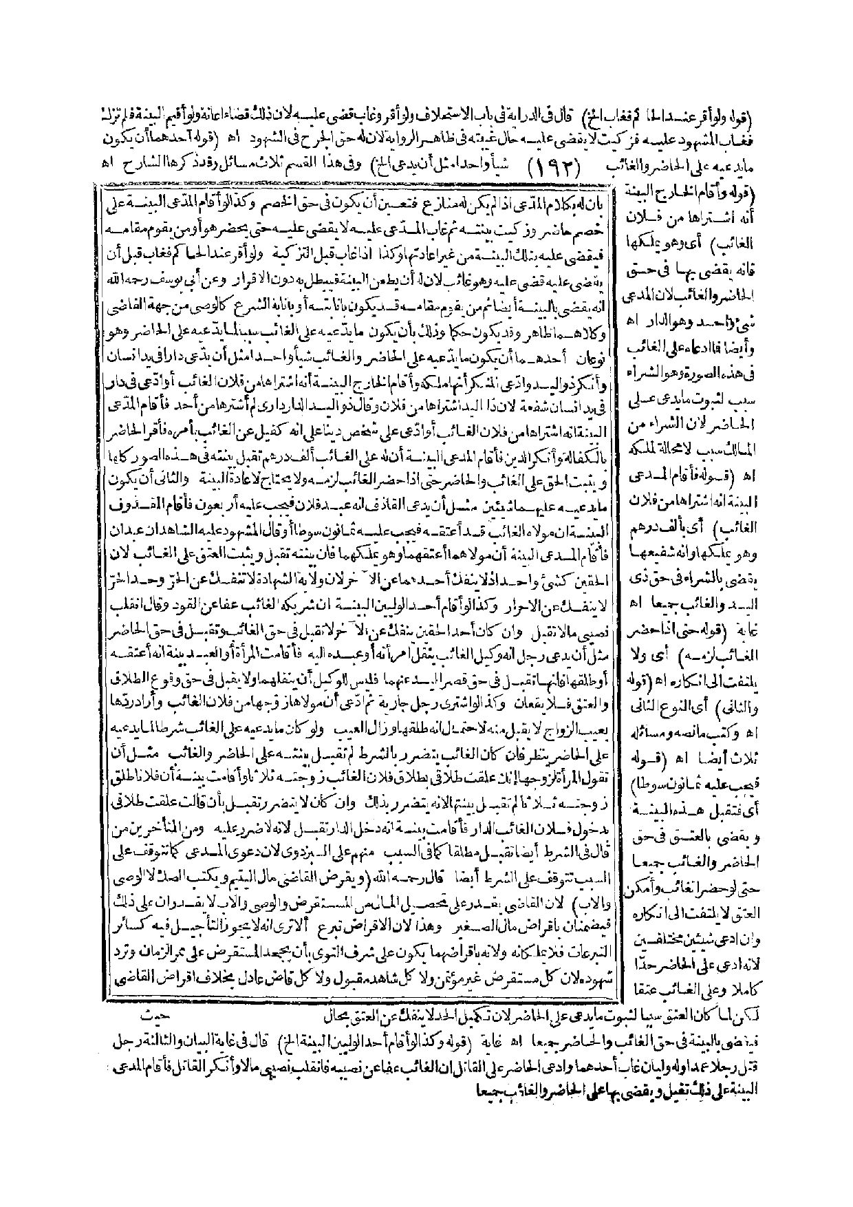 وَالثَّانِي أَنْ يَكُونَ مَا يَدَّعِيه عَلَيْهِمَا شَيْئَيْنِ مِثْلَ أَنْ يَدَّعِيَ الْقَاذِفُ أَنَّهُ عَبْدُ فُلَانٍ فَيَجِبُ عَلَيْهِ أَرْبَعُونَ فَأَقَامَ الْمَقْذُوفُ الْبَيِّنَةَ أَنَّ مَوْلَاهُ الْغَائِبَ قَدْ أَعْتَقَهُ فَيَجِبُ عَلَيْهِ ثَمَانُونَ سَوْطًا أَوْ قَالَ الْمَشْهُودُ عَلَيْهِ الشَّاهِدَانِ عَبْدَانِ فَأَقَامَ الْمُدَّعِي الْبَيِّنَةَ أَنَّ مَوْلَاهُمَا أَعْتَقَهُمَا وَهُوَ يَمْلِكُهُمَا فَإِنَّ بَيِّنَتَهُ تُقْبَلُ وَيَثْبُتُ الْعِتْقُ عَلَى الْغَائِبِ؛ لِأَنَّ الْحَقَّيْنِ كَشَيْءٍ وَاحِدٍ إذْ لَا يَنْفَكُّ أَحَدُهُمَا عَنْ الْآخَرِ؛ لِأَنَّ وِلَايَةَ الشَّهَادَةِ لَا تَنْفَكُّ عَنْ الْحُرِّ وَحَدُّ الْحُرِّ لَا يَنْفَكُّ عَنْ الْأَحْرَارِ، وَكَذَا لَوْ أَقَامَ أَحَدُ الْوَلِيَّيْنِ الْبَيِّنَةَ أَنَّ شَرِيكَهُ الْغَائِبَ عَفَا عَنْ الْقَوَدِ، وَقَالَ انْقَلَبَ نَصِيبِي مَالًا تُقْبَلُ، وَإِنْ كَانَ أَحَدُ الْحَقَّيْنِ يَنْفَكُّ عَنْ الْآخَرِ لَا تُقْبَلُ فِي حَقِّ الْغَائِبِ وَتُقْبَلُ فِي حَقِّ الْحَاضِرِ مِثْلَ أَنْ يَدَّعِيَ رَجُلٌ أَنَّهُ وَكِيلُ الْغَائِبِ بِنَقْلِ امْرَأَتِهِ أَوْ عَبْدِهِ إلَيْهِ فَأَقَامَتْ الْمَرْأَةُ أَوْ الْعَبْدُ بَيِّنَةً أَنَّهُ أَعْتَقَهُ أَوْ طَلَّقَهَا فَإِنَّهَا تُقْبَلُ فِي حَقِّ قَصْرِ الْيَدِ عَنْهُمَا فَلَيْسَ لِلْوَكِيلِ أَنْ يَنْقُلَهُمَا، وَلَا يُقْبَلُ فِي حَقِّ وُقُوعِ الطَّلَاقِ وَالْعِتْقِ، فَلَا يَقَعَانِ، وَكَذَا لَوْ اشْتَرَى رَجُلٌ جَارِيَةً، ثُمَّ ادَّعَى أَنَّ مَوْلَاهَا زَوَّجَهَا مِنْ فُلَانٍ الْغَائِبِ وَأَرَادَ رَدَّهَا بِعَيْبِ الزَّوَاجِ لَا يُقْبَلُ مِنْهُ لِاحْتِمَالِ أَنَّهُ طَلَّقَهَا وَزَالَ الْعَيْبُ، وَلَوْ كَانَ مَا يَدَّعِيه عَلَى الْغَائِبِ شَرْطًا لِمَا يَدَّعِيه عَلَى الْحَاضِرِ يُنْظَرُ، فَإِنْ كَانَ الْغَائِبُ يَتَضَرَّرُ بِالشَّرْطِ لَمْ تُقْبَلْ بَيِّنَتُهُ عَلَى الْحَاضِرِ وَالْغَائِبِ مِثْلُ أَنْ تَقُولَ الْمَرْأَةُ لِزَوْجِهَا إنَّك عَلَّقَتْ طَلَاقِي بِطَلَاقِ فُلَانٍ الْغَائِبِ زَوْجَتَهُ ثَلَاثًا وَأَقَامَتْ بَيِّنَةً أَنَّ فُلَانًا طَلَّقَ زَوْجَتَهُ ثَلَاثًا لَمْ تُقْبَلْ بَيِّنَتُهَا؛ لِأَنَّهُ يَتَضَرَّرُ بِذَلِكَ، وَإِنْ كَانَ لَا يَتَضَرَّرُ تُقْبَلُ بِأَنْ قَالَتْ عَلَّقْتَ طَلَاقِي بِدُخُولِ فُلَانٍ الْغَائِبَ الدَّارَ فَأَقَامَتْ بَيِّنَةً أَنَّهُ دَخَلَ الدَّارَ تُقْبَلُ لِأَنَّهُ لَا ضَرَرَ عَلَيْهِ وَمِنْ الْمُتَأَخِّرِينَ مَنْ قَالَ فِي الشَّرْطِ أَيْضًا تُقْبَلُ مُطْلَقًا كَمَا فِي السَّبَبِ مِنْهُمْ عَلَى الْبَزْدَوِيِّ؛ لِأَنَّ دَعْوَى الْمُدَّعِي كَمَا تَتَوَقَّفُ عَلَى السَّبَبِ تَتَوَقَّفُ عَلَى الشَّرْطِ أَيْضًا.