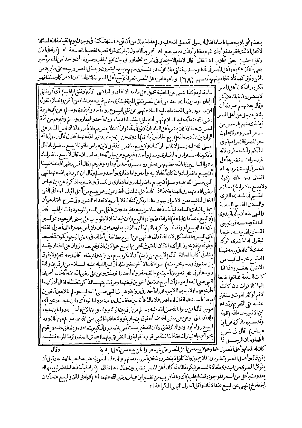 (قَوْلُهُ: «وَلَا يَبِعْ حَاضِرٌ لِبَادٍ») الْحَاضِرُ الْمُقِيمُ فِي الْمُدُنِ وَالْقُرَى وَالْبَادِي الْمُقِيمُ بِالْبَادِيَةِ وَالْمَنْهِيُّ عَنْهُ أَنْ يَأْتِيَ الْبَدْوِيُّ الْبَلْدَةَ وَمَعَهُ قُوتٌ يَبْغِي التَّسَارُعَ إلَى بَيْعِهِ رَخِيصًا فَيَقُولُ لَهُ الْحَضَرِيُّ اُتْرُكْهُ عِنْدِي لِأُغَالِيَ فِي بَيْعِهِ فَهَذَا الصَّنِيعُ مُحَرَّمٌ لِمَا فِيهِ مِنْ الْإِضْرَارِ بِالْغَيْرِ وَهَذَا إذَا كَانَتْ السِّلْعَةُ مِمَّا تَعُمُّ الْحَاجَةُ إلَيْهَا كَالْأَقْوَاتِ فَإِنْ كَانَتْ لَا تَعُمُّ أَوْ أَكْثَرَ الْقُوتِ وَاسْتَغْنَى عَنْهُ فَفِي التَّحْرِيمِ تَرَدُّدٌ. اهـ. ابْنُ الْأَثِيرِ - رَحِمَهُ اللَّهُ - (قَوْلُهُ وَتَفْسِيرُهُ مَا ذَكَرْنَا عَنْ ابْنِ عَبَّاسٍ) قَالَ فِي شَرْحِ الطَّحَاوِيِّ إنَّ الرَّجُلَ إذَا كَانَ لَهُ طَعَامٌ وَأَهْلُ الْمِصْرِ فِي قَحْطٍ وَهُوَ لَا يَبِيعُهُ مِنْ أَهْلِ الْمِصْرِ حَتَّى يَتَوَسَّعُوا وَلَكِنْ يَبِيعُهُ مِنْ أَهْلِ الْبَادِيَةِ بِثَمَنٍ غَالٍ وَأَهْلُ الْمِصْرِ يَتَضَرَّرُونَ فَلَا يَجُوزُ وَإِنْ كَانُوا لَا يَتَضَرَّرُونَ فَلَا بَأْسَ بِبَيْعِهِ مِنْهُمْ، وَإِلَى هَذِهِ الصُّورَةِ ذَهَبَ صَاحِبُ الْهِدَايَةِ وَقِيلَ أَنْ يَتَوَكَّلَ الْمِصْرِيُّ مِنْ الْبَدْوِيِّ لِمُغَالَاةِ السِّعْرِ فَيُكْرَهُ ذَلِكَ إذَا كَانَ أَهْلُ الْمِصْرِ يَتَضَرَّرُونَ بِذَلِكَ. اهـ. أَتْقَانِيٌّ (قَوْلُهُ فَيَأْخُذُهَا الْحَاضِرُ لِيَبِيعَهَا لَهُ بَعْدَ وَقْتٍ بِأَغْلَى مِنْ السِّعْرِ الْمَوْجُودِ وَقْتَ الْجَلْبِ) أَيْ وَهَذَا قَرِيبٌ مِنْ تَفْسِيرِ ابْنِ عَبَّاسٍ - رَضِيَ اللَّهُ عَنْهُمَا -. اهـ. .