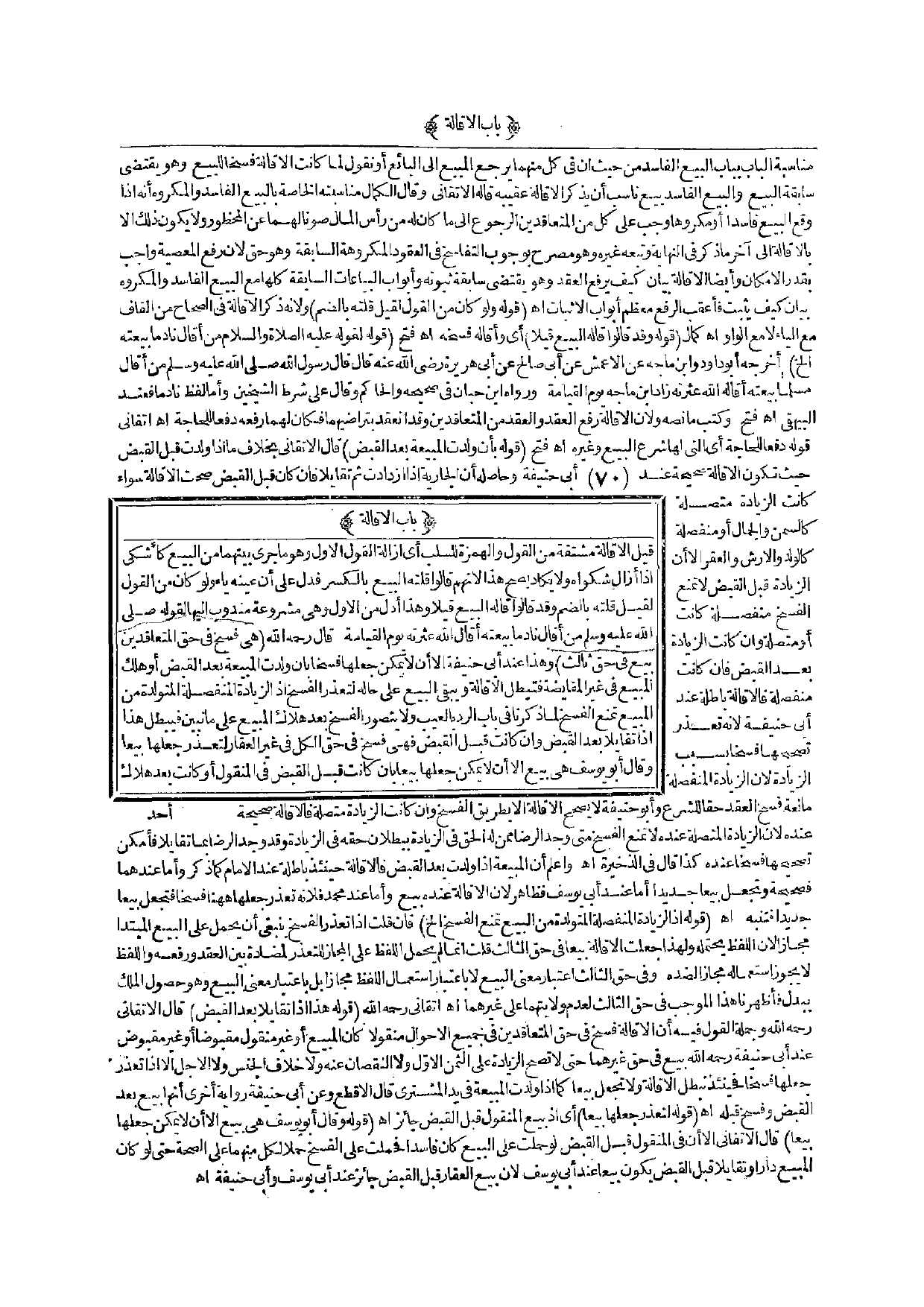 (بَابُ الْإِقَالَةِ) مُنَاسَبَةُ الْبَابِ بِبَابِ الْبَيْعِ الْفَاسِدِ مِنْ حَيْثُ إنَّ فِي كُلٍّ مِنْهُمَا يَرْجِعُ الْمَبِيعُ إلَى الْبَائِعِ أَوْ نَقُولُ لَمَّا كَانَتْ الْإِقَالَةُ فَسْخًا لِلْبَيْعِ وَهُوَ يَقْتَضِي سَابِقَةَ الْبَيْعِ وَالْبَيْعُ الْفَاسِدُ بَيْعٌ نَاسَبَ أَنْ يَذْكُرَ الْإِقَالَةَ عَقِيبَهُ قَالَهُ الْأَتْقَانِيُّ، وَقَالَ الْكَمَالُ مُنَاسَبَتُهُ الْخَاصَّةُ بِالْبَيْعِ الْفَاسِدِ وَالْمَكْرُوهِ أَنَّهُ إذَا وَقَعَ الْبَيْعُ فَاسِدًا أَوْ مَكْرُوهًا وَجَبَ عَلَى كُلٍّ مِنْ الْمُتَعَاقِدَيْنِ الرُّجُوعُ إلَى مَا كَانَ لَهُ مِنْ رَأْسِ الْمَالِ صَوْنًا لَهُمَا عَنْ الْمَحْظُورِ وَلَا يَكُونُ ذَلِكَ إلَّا بِالْإِقَالَةِ إلَى آخِرِ مَا ذُكِرَ فِي النِّهَايَةِ وَتَبِعَهُ غَيْرُهُ وَهُوَ مُصَرَّحٌ بِوُجُوبِ التَّفَاسُخِ فِي الْعُقُودِ الْمَكْرُوهَةِ السَّابِقَةِ وَهُوَ حَقٌّ لِأَنَّ رَفْعَ الْمَعْصِيَةِ وَاجِبٌ بِقَدْرِ الْإِمْكَانِ وَأَيْضًا الْإِقَالَةُ بَيَانُ كَيْفَ يُرْفَعُ الْعَقْدُ وَهُوَ يَقْتَضِي سَابِقَةَ ثُبُوتِهِ وَأَبْوَابُ الْبِيَاعَاتِ السَّابِقَةِ كُلِّهَا مَعَ الْبَيْعِ الْفَاسِدِ وَالْمَكْرُوهُ بَيَانُ كَيْفَ يَثْبُتُ فَأَعْقَبَ الرَّفْعَ مُعْظَمَ أَبْوَابِ الْإِثْبَاتِ اهـ. (قَوْلُهُ: وَلَوْ كَانَ مِنْ الْقَوْلِ لَقِيلَ قُلْته بِالضَّمِّ) وَلِأَنَّهُ ذَكَرَ الْإِقَالَةَ فِي الصِّحَاحِ مِنْ الْقَافِ مَعَ الْيَاءِ لَا مَعَ الْوَاوِ. اهـ. كَمَالٌ. (قَوْلُهُ: وَقَدْ قَالُوا قَالَهُ الْبَيْعُ قَيْلًا) أَيْ وَأَقَالَهُ فَسَخَهُ. اهـ. فَتْحٌ.