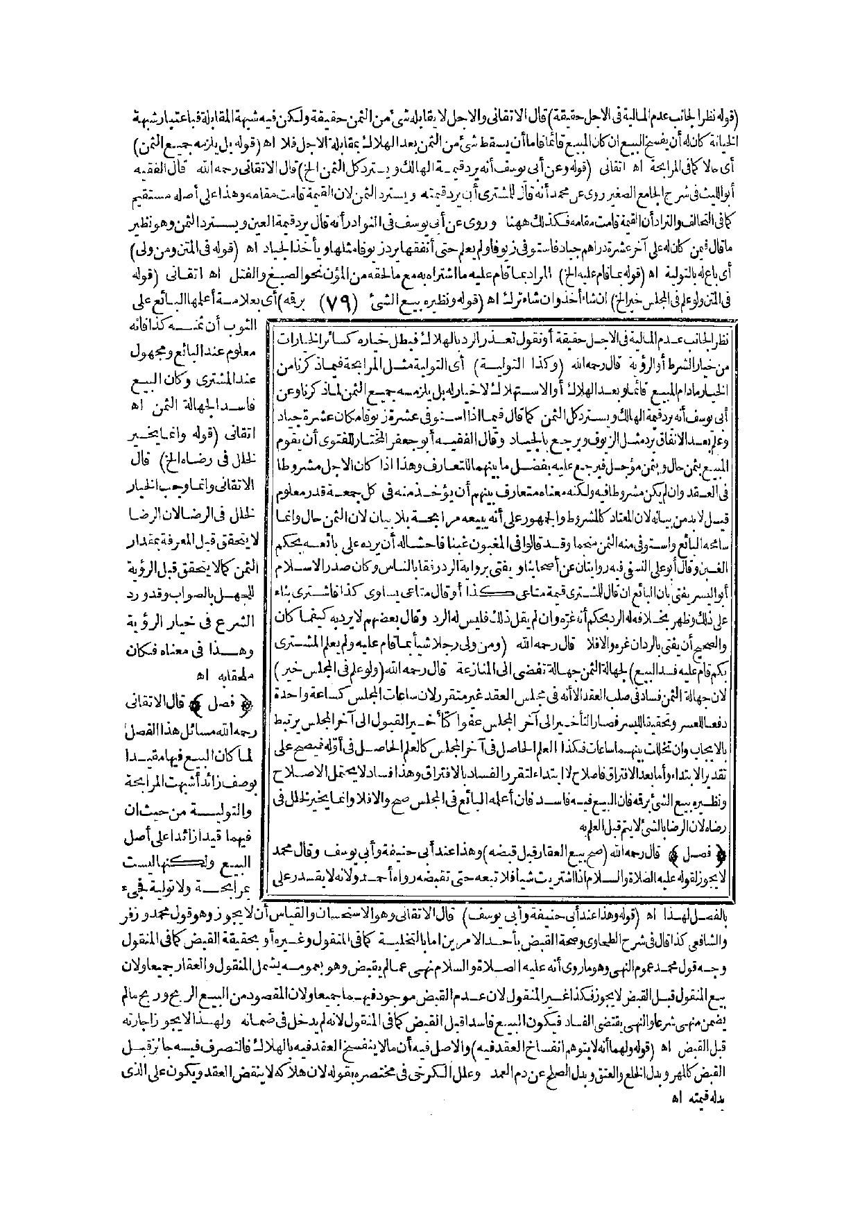 (فَصْلٌ) قَالَ الْأَتْقَانِيُّ - رَحِمَهُ اللَّهُ - مَسَائِلُ هَذَا الْفَصْلِ لَمَّا كَانَ الْبَيْعُ فِيهَا مُقَيَّدًا بِوَصْفٍ زَائِدٍ أَشْبَهَتْ الْمُرَابَحَةَ وَالتَّوْلِيَةَ مِنْ حَيْثُ إنَّ فِيهِمَا قَيْدًا زَائِدًا عَلَى أَصْلِ الْبَيْعِ وَلَكِنَّهَا لَيْسَتْ بِمُرَابَحَةٍ وَلَا تَوْلِيَةٍ فَجِيءَ بِالْفَصْلِ لِهَذَا. اهـ. (قَوْلُهُ وَهَذَا عِنْدَ أَبِي حَنِيفَةَ وَأَبِي يُوسُفَ) قَالَ الْأَتْقَانِيُّ وَهُوَ الِاسْتِحْسَانُ وَالْقِيَاسُ أَنْ لَا يَجُوزَ وَهُوَ قَوْلُ مُحَمَّدٍ وَزُفَرَ وَالشَّافِعِيِّ كَذَا قَالَ فِي شَرْحِ الطَّحَاوِيِّ وَصِحَّةُ الْقَبْضِ بِأَحَدِ الْأَمْرَيْنِ إمَّا بِالتَّخْلِيَةِ كَمَا فِي الْمَنْقُولِ وَغَيْرِهِ أَوْ بِحَقِيقَةِ الْقَبْضِ كَمَا فِي الْمَنْقُولِ وَجْهُ قَوْلِ مُحَمَّدٍ عُمُومُ النَّهْيِ وَهُوَ مَا رُوِيَ أَنَّهُ «- عَلَيْهِ الصَّلَاةُ وَالسَّلَامُ - نَهَى عَمَّا لَمْ يُقْبَضْ» وَهُوَ بِعُمُومِهِ يَشْمَلُ الْمَنْقُولَ وَالْعَقَارَ جَمِيعًا وَلِأَنَّ بَيْعَ الْمَنْقُولِ قَبْلَ الْقَبْضِ لَا يَجُوزُ فَكَذَا غَيْرُ الْمَنْقُولِ؛ لِأَنَّ عَدَمَ الْقَبْضِ مَوْجُودٌ فِيهِمَا جَمِيعًا وَلِأَنَّ الْمَقْصُودَ مِنْ الْبَيْعِ الرِّبْحُ وَرِبْحُ مَا لَمْ يُضْمَنْ مَنْهِيٌّ شَرْعًا وَالنَّهْيُ يَقْتَضِي الْفَسَادَ فَيَكُونُ الْبَيْعُ فَاسِدًا قَبْلَ الْقَبْضِ كَمَا فِي الْمَنْقُولِ؛ لِأَنَّهُ لَمْ يَدْخُلْ فِي ضَمَانِهِ، وَلِهَذَا لَا يَجُوزُ إجَارَتُهُ قَبْلَ الْقَبْضِ اهـ (قَوْلُهُ وَلَهُمَا أَنَّهُ لَا يُتَوَهَّمُ انْفِسَاخُ الْعَقْدِ فِيهِ) وَالْأَصْلُ فِيهِ أَنَّ مَا لَا يَنْفَسِخُ الْعَقْدُ فِيهِ بِالْهَلَاكِ فَالتَّصَرُّفُ فِيهِ جَائِزٌ قَبْلَ الْقَبْضِ كَالْمَهْرِ وَبَدَلِ الْخُلْعِ وَالْعِتْقِ وَبَدَلِ الصُّلْحِ عَنْ دَمِ الْعَمْدِ وَعَلَّلَ الْكَرْخِيُّ فِي مُخْتَصَرِهِ بِقَوْلِهِ؛ لِأَنَّ هَلَاكَهُ لَا يَنْقُضُ الْعَقْدَ وَيَكُونُ عَلَى الَّذِي بَدَّلَهُ قِيمَتُهُ اهـ