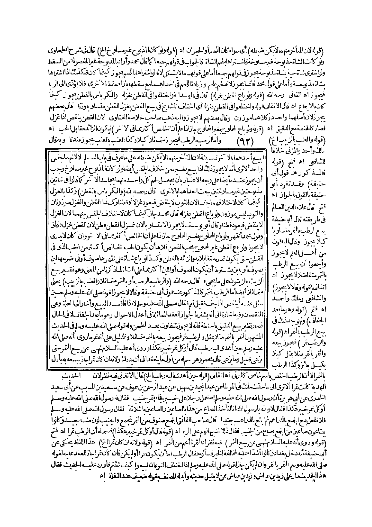 (قَوْلُهُ وَالْعِنَبُ بِالزَّبِيبِ إلَخْ) وَأَمَّا الرُّطَبُ بِالرُّطَبِ فَيَجُوزُ مُتَمَاثِلًا كَيْلًا وَكَذَا الْعِنَبُ بِالْعِنَبِ يَجُوزُ عِنْدَنَا وَبِهِ قَالَ مَالِكٌ وَأَحْمَدُ وَالْمُزَنِيِّ خِلَافًا لِلشَّافِعِيِّ. اهـ. فَتْحٌ (قَوْلُهُ فَالْمَذْكُورُ هُنَا قَوْلُ أَبِي حَنِيفَةَ) وَقَدْ تَفَرَّدَ أَبُو حَنِيفَةَ بِالْقَوْلِ بِالْجَوَازِ اهـ فَتْحٌ قَالَ عَلَاءُ الدِّينِ: الْعَالِمُ فِي طَرِيقَتِهِ قَالَ أَبُو حَنِيفَةَ: بَيْعُ الرُّطَبِ بِالتَّمْرِ مُتَسَاوِيًا كَيْلًا يَجُوزُ وَقَالَ الْبَاقُونَ مِنْ أَهْلِ الْعِلْمِ: لَا يَجُوزُ وَأَجْمَعُوا أَنَّ بَيْعَ الرُّطَبِ بِالتَّمْرِ مُتَفَاضِلًا لَا يَجُوزُ. اهـ. أَتْقَانِيٌّ (قَوْلُهُ وَقَالَا: لَا يَجُوزُ) وَالشَّافِعِيُّ وَمَالِكٌ وَأَحْمَدُ اهـ فَتْحٌ (قَوْلُهُ وَهُوَ مَا بَعْدَ الْجَفَافِ) وَلَمْ يُوجَدْ ذَلِكَ فِي بَيْعِ الرُّطَبِ بِالتَّمْرِ. اهـ. (قَوْلُهُ وَالرُّطَبُ تَمْرٌ) فَيَجُوزُ بَيْعُهُ وَالتَّمْرُ بِالتَّمْرِ مِثْلًا بِمِثْلٍ كَيْلًا بِكَيْلٍ جَائِزٌ وَكَذَا الرُّطَبُ بِالتَّمْرِ إلَّا أَنَّ الرُّطَبَ اخْتَصَّ بِاسْمٍ خَاصٍّ كَالْبَرْنِيِّ. اهـ. أَتْقَانِيٌّ (قَوْلُهُ حِينَ أُهْدِيَ إلَيْهِ رُطَبٌ إلَخْ) قَالَ الْأَتْقَانِيُّ فِيهِ نَظَرٌ؛ لِأَنَّ الْهَدِيَّةَ كَانَتْ تَمْرًا أَلَا تَرَى إلَى مَا حَدَّثَ مَالِكٌ فِي الْمُوَطَّإِ عَنْ عَبْدِ الْمَجِيدِ بْنِ سُهَيْلٍ عَنْ عَبْدِ الرَّحْمَنِ بْنِ عَوْفٍ عَنْ سَعِيدِ بْنِ الْمُسَيِّبِ عَنْ أَبِي سَعِيدٍ الْخُدْرِيِّ عَنْ أَبِي هُرَيْرَةَ «أَنَّ رَسُولَ اللَّهِ - صَلَّى اللَّهُ عَلَيْهِ وَسَلَّمَ - اسْتَعْمَلَ رَجُلًا عَلَى خَيْبَرَ فَجَاءَ بِتَمْرٍ جَنِيبٍ فَقَالَ لَهُ رَسُولُ اللَّهِ - صَلَّى اللَّهُ عَلَيْهِ وَسَلَّمَ -: أَوَكُلُّ تَمْرِ خَيْبَرَ هَكَذَا؟ فَقَالَ: لَا، وَاَللَّهِ يَا رَسُولَ اللَّهِ إنَّا لَنَأْخُذُ الصَّاعَ مِنْ هَذَا بِالصَّاعَيْنِ وَالصَّاعَيْنِ بِالثَّلَاثَةِ فَقَالَ رَسُولُ اللَّهِ - صَلَّى اللَّهُ عَلَيْهِ وَسَلَّمَ -: فَلَا تَفْعَلْ بِعْ الْجَمْعَ بِالدَّرَاهِمِ، ثُمَّ ابْتَعْ بِالدَّرَاهِمِ جَنِيبًا» قَالَ صَاحِبُ الْفَائِقِ: الْجَمْعُ صُنُوفٌ مِنْ التَّمْرِ تُجْمَعُ وَالْجَنِيبُ لَوْنٌ مِنْهُ جَيِّدٌ وَكَانُوا يَبْتَاعُونَ صَاعَيْنِ مِنْ الْجَمْعِ بِصَاعٍ مِنْ الْجَنِيبِ فَقَالَ ذَلِكَ تَنْبِيهًا لَهُمْ عَلَى الرِّبَا اهـ (قَوْلُهُ «قَالَ: أَوَكُلُّ تَمْرِ خَيْبَرَ هَكَذَا») فَسَمَّاهُ أَيْ الرُّطَبَ تَمْرًا. اهـ. فَتْحٌ (قَوْلُهُ وَرُوِيَ أَنَّهُ - عَلَيْهِ السَّلَامُ - نَهَى عَنْ بَيْعِ الثَّمَرِ) فِيهِ نَظَرٌ إذْ الثَّمَرَةُ أَعَمُّ مِنْ التَّمْرِ. اهـ. (قَوْلُهُ وَلِأَنَّهُ إنْ كَانَ تَمْرًا إلَخْ) هَذَا اللَّفْظُ يُحْكَى عَنْ أَبِي حَنِيفَةَ أَنَّهُ دَخَلَ بَغْدَادَ وَكَانُوا أَشِدَّاءَ عَلَيْهِ لِمُخَالَفَةِ الْخَبَرِ فَسَأَلُوهُ فَقَالَ الرُّطَبُ إمَّا أَنْ يَكُونَ تَمْرًا أَوْ لَمْ يَكُنْ فَإِنْ كَانَ تَمْرًا جَازَ الْعَقْدُ عَلَيْهِ لِقَوْلِهِ - صَلَّى اللَّهُ عَلَيْهِ وَسَلَّمَ - «التَّمْرُ بِالتَّمْرِ» وَإِنْ لَمْ يَكُنْ جَازَ لِقَوْلِهِ - صَلَّى اللَّهُ عَلَيْهِ وَسَلَّمَ - «إذَا اخْتَلَفَ النَّوْعَانِ فَبِيعُوا كَيْفَ شِئْتُمْ» فَأُورِدَ عَلَيْهِ الْحَدِيثُ فَقَالَ: هَذَا الْحَدِيثُ دَارَ عَلَى زَيْدِ بْنِ عَيَّاشٍ وَزَيْدُ بْنُ عَيَّاشٍ مِمَّنْ لَا يُقْبَلُ حَدِيثُهُ وَأَبْدَلَهُ الْمُصَنِّفُ بِقَوْلِهِ ضَعِيفٌ عِنْدَ النَّقَلَةِ. اهـ.