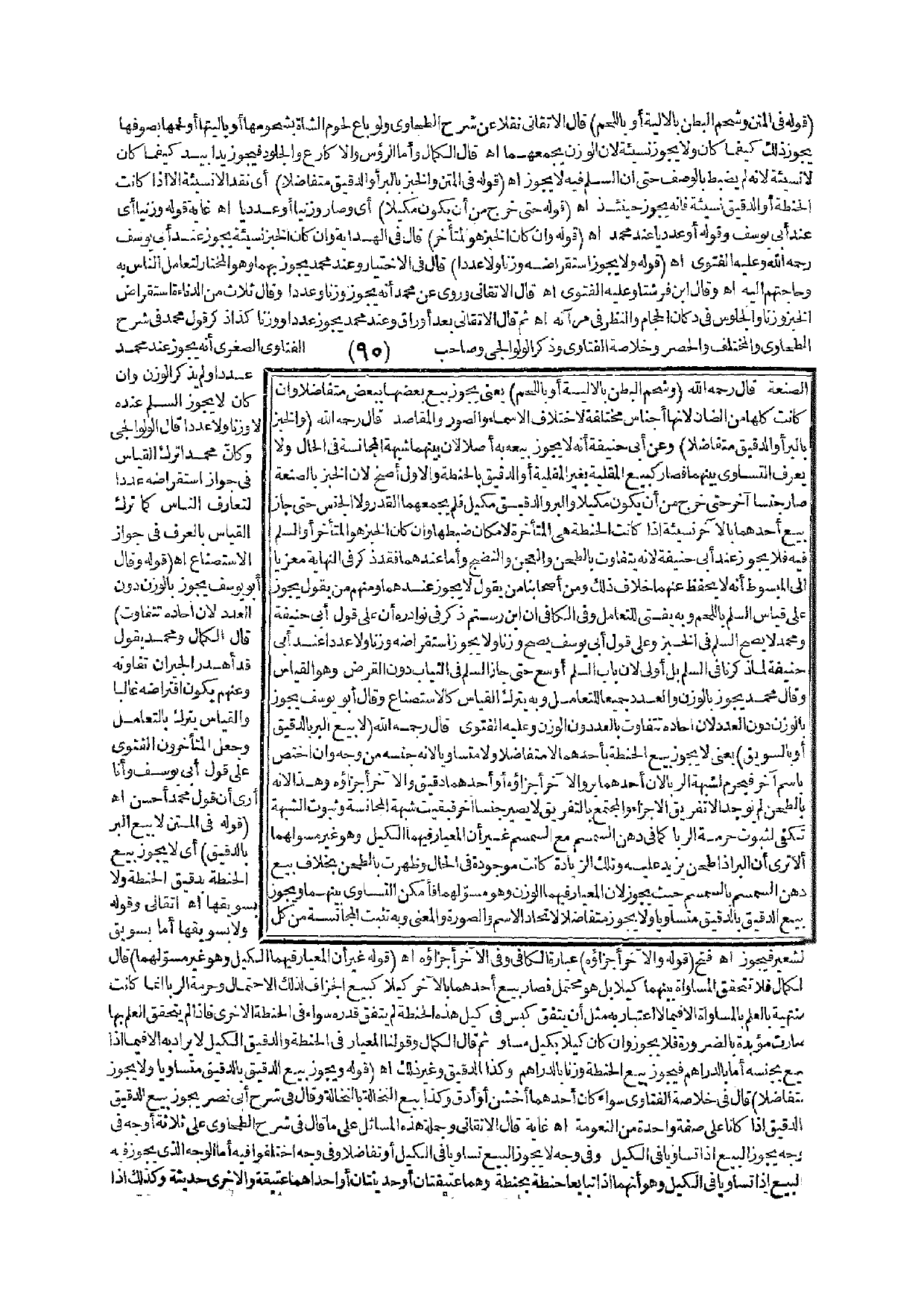 (قَوْلُهُ فِي الْمَتْنِ وَالْخُبْزُ بِالْبُرِّ أَوْ الدَّقِيقِ مُتَفَاضِلًا) أَيْ نَقْدًا لَا نَسِيئَةً إلَّا إذَا كَانَتْ الْحِنْطَةُ أَوْ الدَّقِيقُ نَسِيئَةً فَإِنَّهُ يَجُوزُ حِينَئِذٍ. اهـ. (قَوْلُهُ حَتَّى خَرَجَ مِنْ أَنْ يَكُونَ مَكِيلًا) أَيْ وَصَارَ وَزْنِيًّا أَوْ عَدَدِيًّا. اهـ. غَايَةٌ قَوْلُهُ وَزْنِيًّا أَيْ عِنْدَ أَبِي يُوسُفَ وَقَوْلُهُ أَوْ عَدَدِيًّا عِنْدَ مُحَمَّدٍ. اهـ. (قَوْلُهُ وَإِنْ كَانَ الْخُبْزُ هُوَ الْمُتَأَخِّرُ) قَالَ فِي الْهِدَايَةِ وَإِنْ كَانَ الْخُبْزُ نَسِيئَةً يَجُوزُ عِنْدَ أَبِي يُوسُفَ - رَحِمَهُ اللَّهُ - وَعَلَيْهِ الْفَتْوَى اهـ (قَوْلُهُ وَلَا يَجُوزُ اسْتِقْرَاضُهُ وَزْنًا وَلَا عَدَدًا) قَالَ فِي الِاخْتِيَارِ وَعِنْدَ مُحَمَّدٍ: يَجُوزُ بِهِمَا وَهُوَ الْمُخْتَارُ لِتَعَامُلِ النَّاسِ بِهِ وَحَاجَتِهِمْ إلَيْهِ اهـ وَقَالَ ابْنُ فِرِشْتَا: وَعَلَيْهِ الْفَتْوَى اهـ قَالَ الْأَتْقَانِيُّ: وَرُوِيَ عَنْ مُحَمَّدٍ أَنَّهُ يَجُوزُ وَزْنًا وَعَدَدًا وَقَالَ: ثَلَاثٌ مِنْ الدَّنَاءَةِ اسْتِقْرَاضُ الْخُبْزِ وَزْنًا وَالْجُلُوسُ فِي دُكَّانِ الْحَجَّامِ وَالنَّظَرُ فِي مِرْآتِهِ. اهـ. ثُمَّ قَالَ الْأَتْقَانِيُّ بَعْدَ أَوْرَاقٍ وَعِنْدَ مُحَمَّدٍ يَجُوزُ عَدَدًا وَوَزْنًا كَذَا ذَكَرَ قَوْلُ مُحَمَّدٍ فِي شَرْحِ الطَّحَاوِيِّ وَالْمُخْتَلَفِ وَالْحَصْرِ وَخُلَاصَةِ الْفَتَاوَى وَذَكَرَ الْوَلْوَالِجِيُّ وَصَاحِبُ الْفَتَاوَى الصُّغْرَى أَنَّهُ يَجُوزُ عِنْدَ مُحَمَّدٍ عَدَدًا وَلَمْ يَذْكُرْ الْوَزْنَ وَإِنْ كَانَ لَا يَجُوزُ السَّلَمُ عِنْدَهُ لَا وَزْنًا وَلَا عَدَدًا قَالَ الْوَلْوَالِجِيُّ وَكَأَنَّ مُحَمَّدًا تَرَكَ الْقِيَاسَ فِي جَوَازِ اسْتِقْرَاضِهِ عَدَدًا لِتَعَارُفِ النَّاسِ كَمَا تَرَكَ الْقِيَاسَ بِالْعُرْفِ فِي جَوَازِ الِاسْتِصْنَاعِ. اهـ. (قَوْلُهُ وَقَالَ أَبُو يُوسُفَ: يَجُوزُ بِالْوَزْنِ دُونَ الْعَدَدِ؛ لِأَنَّ أُحَادَهُ تَتَفَاوَتُ) قَالَ الْكَمَالُ وَمُحَمَّدٌ: يَقُولُ قَدْ أَهْدَرَ الْجِيرَانُ تَفَاوُتَهُ وَعَنْهُمْ يَكُونُ اقْتِرَاضُهُ غَالِبًا وَالْقِيَاسُ يُتْرَكُ بِالتَّعَامُلِ وَجَعَلَ الْمُتَأَخِّرُونَ الْفَتْوَى عَلَى قَوْلِ أَبِي يُوسُفَ وَأَنَا أَرَى أَنَّ قَوْلَ مُحَمَّدٍ أَحْسَنُ. اهـ. .