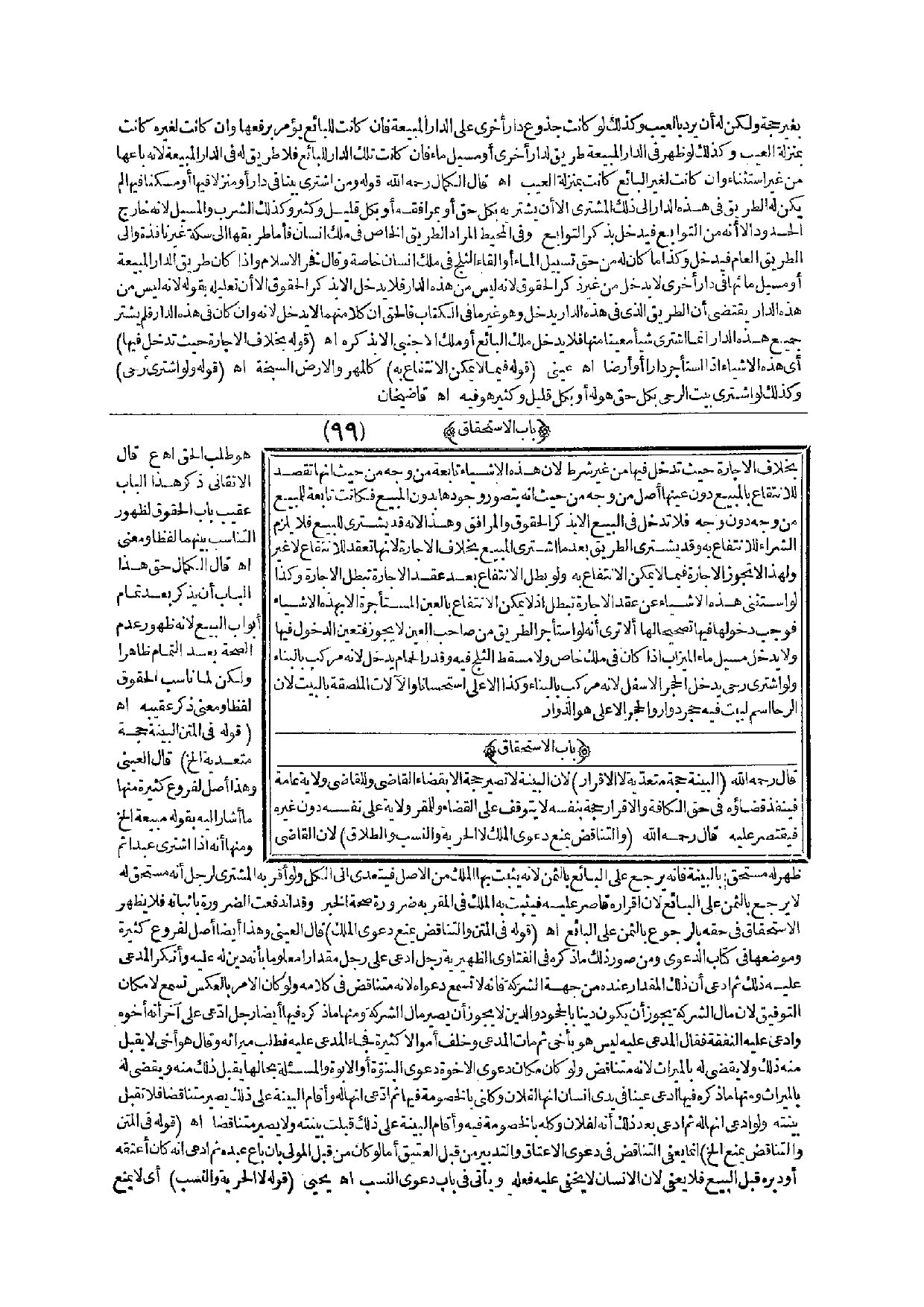 (بَابُ الِاسْتِحْقَاقِ) هُوَ طَلَبُ الْحَقِّ اهـ ع قَالَ الْأَتْقَانِيُّ ذُكِرَ هَذَا الْبَابُ عَقِيبَ بَابِ الْحُقُوقِ لِظُهُورِ التَّنَاسُبِ بَيْنَهُمَا لَفْظًا وَمَعْنًى اهـ قَالَ الْكَمَالُ: حَقُّ هَذَا الْبَابِ أَنْ يُذْكَرَ بَعْدَ تَمَامِ أَبْوَابِ الْبَيْعِ؛ لِأَنَّهُ ظُهُورُ عَدَمِ الصِّحَّةِ بَعْدَ التَّمَامِ ظَاهِرًا وَلَكِنْ لَمَّا نَاسَبَ الْحُقُوقَ لَفْظًا وَمَعْنًى ذُكِرَ عَقِيبَهُ. اهـ. (قَوْلُهُ فِي الْمَتْنِ الْبَيِّنَةُ حُجَّةٌ مُتَعَدِّيَةٌ إلَخْ) قَالَ الْعَيْنِيُّ: وَهَذَا أَصْلٌ لِفُرُوعٍ كَثِيرَةٍ مِنْهَا مَا أَشَارَ إلَيْهِ بِقَوْلِهِ مَبِيعَةٌ إلَخْ وَمِنْهَا أَنَّهُ إذَا اشْتَرَى عَبْدًا، ثُمَّ ظَهَرَ لَهُ مُسْتَحِقٌّ بِالْبَيِّنَةِ فَإِنَّهُ يَرْجِعُ عَلَى الْبَائِعِ بِالثَّمَنِ؛ لِأَنَّهُ يَثْبُتُ بِهَا الْمِلْكُ مِنْ الْأَصْلِ فَيَتَعَدَّى إلَى الْكُلِّ وَلَوْ أَقَرَّ بِهِ الْمُشْتَرِي لِرَجُلٍ أَنَّهُ مُسْتَحِقٌّ لَهُ لَا يَرْجِعُ بِالثَّمَنِ عَلَى الْبَائِعِ؛ لِأَنَّ إقْرَارَهُ قَاصِرٌ عَلَيْهِ فَيَثْبُتُ بِهِ الْمِلْكُ فِي الْمُقَرِّ بِهِ ضَرُورَةَ صِحَّةِ الْخَبَرِ وَقَدْ انْدَفَعَتْ الضَّرُورَةُ بِإِثْبَاتِهِ فَلَا يَظْهَرُ الِاسْتِحْقَاقُ فِي حَقِّهِ بِالرُّجُوعِ بِالثَّمَنِ عَلَى الْبَائِعِ اهـ (قَوْلُهُ فِي الْمَتْنِ وَالتَّنَاقُضُ يَمْنَعُ دَعْوَى الْمِلْكِ) قَالَ الْعَيْنِيُّ: وَهَذَا أَيْضًا أَصْلٌ لِفُرُوعٍ كَثِيرَةٍ وَمَوْضِعُهَا فِي كِتَابِ الدَّعْوَى وَمِنْ صُوَرِ ذَلِكَ مَا ذَكَرَهُ فِي الْفَتَاوَى الظَّهِيرِيَّةِ رَجُلٌ ادَّعَى عَلَى رَجُلٍ مِقْدَارًا مَعْلُومًا بِأَنَّهُ دَيْنٌ لَهُ عَلَيْهِ وَأَنْكَرَ الْمُدَّعَى عَلَيْهِ ذَلِكَ، ثُمَّ ادَّعَى أَنَّ ذَلِكَ الْمِقْدَارَ عِنْدَهُ مِنْ جِهَةِ الشَّرِكَةِ فَإِنَّهُ لَا تُسْمَعُ دَعْوَاهُ؛ لِأَنَّهُ مُتَنَاقِضٌ فِي كَلَامِهِ.