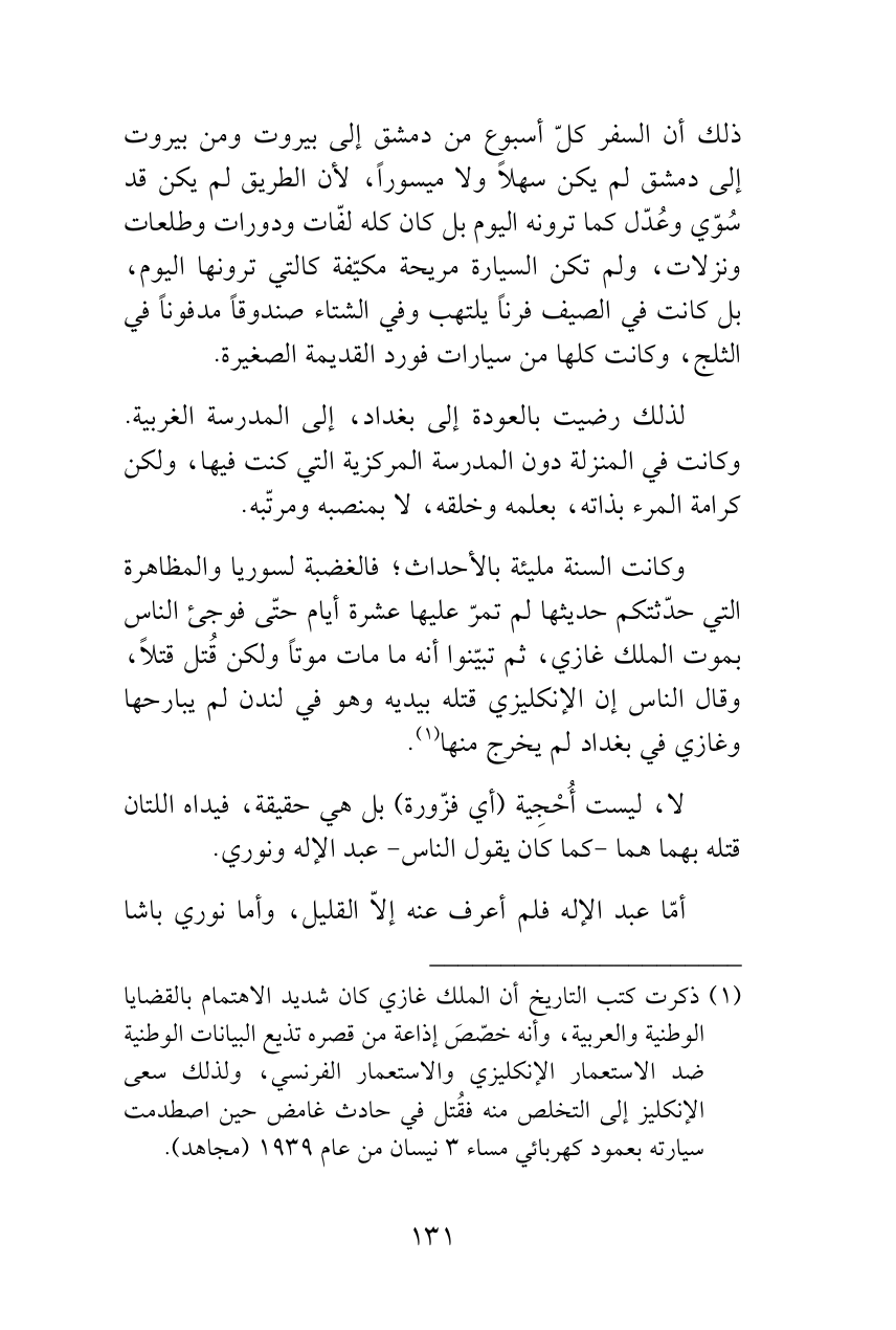 وكانت السنة مليئة بالأحداث؛ فالغضبة لسوريا والمظاهرة التي حدّثتكم حديثها لم تمرّ عليها عشرة أيام حتّى فوجئ الناس بموت الملك غازي، ثم تبيّنوا أنه ما مات موتاً ولكن قُتل قتلاً، وقال الناس إن الإنكليزي قتله بيديه وهو في لندن لم يبارحها وغازي في بغداد لم يخرج منها (¬1).