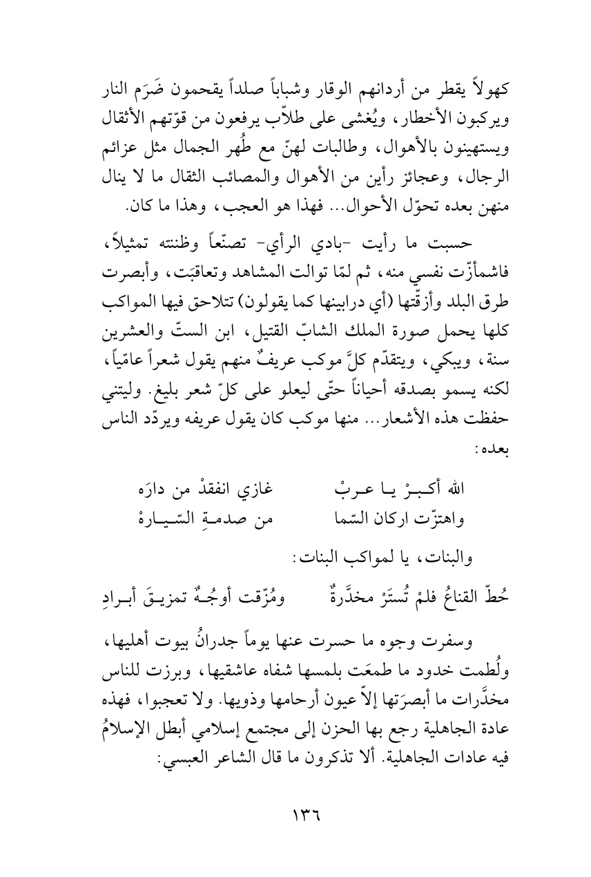 وسفرت وجوه ما حسرت عنها يوماً جدرانُ بيوتأهليها، ولُطمت خدود ما طمعَت بلمسها شفاه عاشقيها، وبرزت للناس مخدَّرات ما أبصرَتها إلاّ عيون أرحامهاوذويها. ولاتعجبوا، فهذه عادة الجاهلية رجع بها الحزن إلى مجتمع إسلامي أبطل الإسلامُ فيه عادات الجاهلية. ألا تذكرون ما قال الشاعر العبسي: