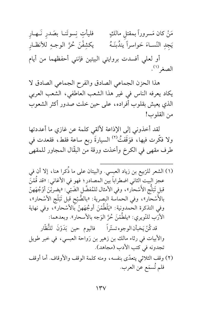 هذا الحزن الجماعي الصادق والفرح الجماعي الصادق لا يكاد يعرفه الناس في غير هذا الشعب العاطفي، الشعب العربي الذي يعيش بقلوب أفراده، على حين خلت صدور أكثر الشعوب من القلوب!
