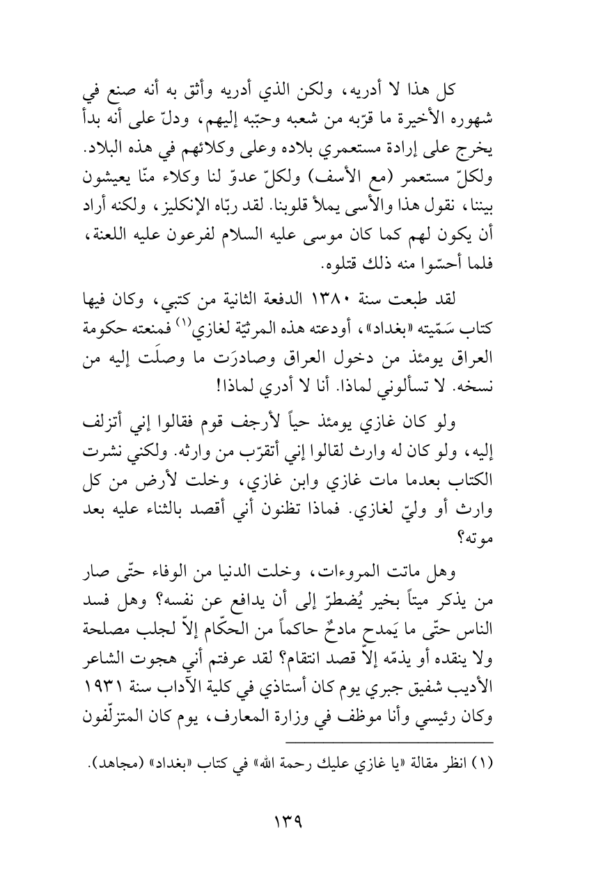 لقد طبعت سنة 1380 الدفعة الثانية من كتبي، وكان فيها كتاب سَمّيته «بغداد»، أودعته هذه المرثيّة لغازي (¬1) فمنعته حكومة العراق يومئذ من دخول العراق وصادرَت ما وصلَت إليه من نسخه. لا تسألوني لماذا. أنا لا أدري لماذا!