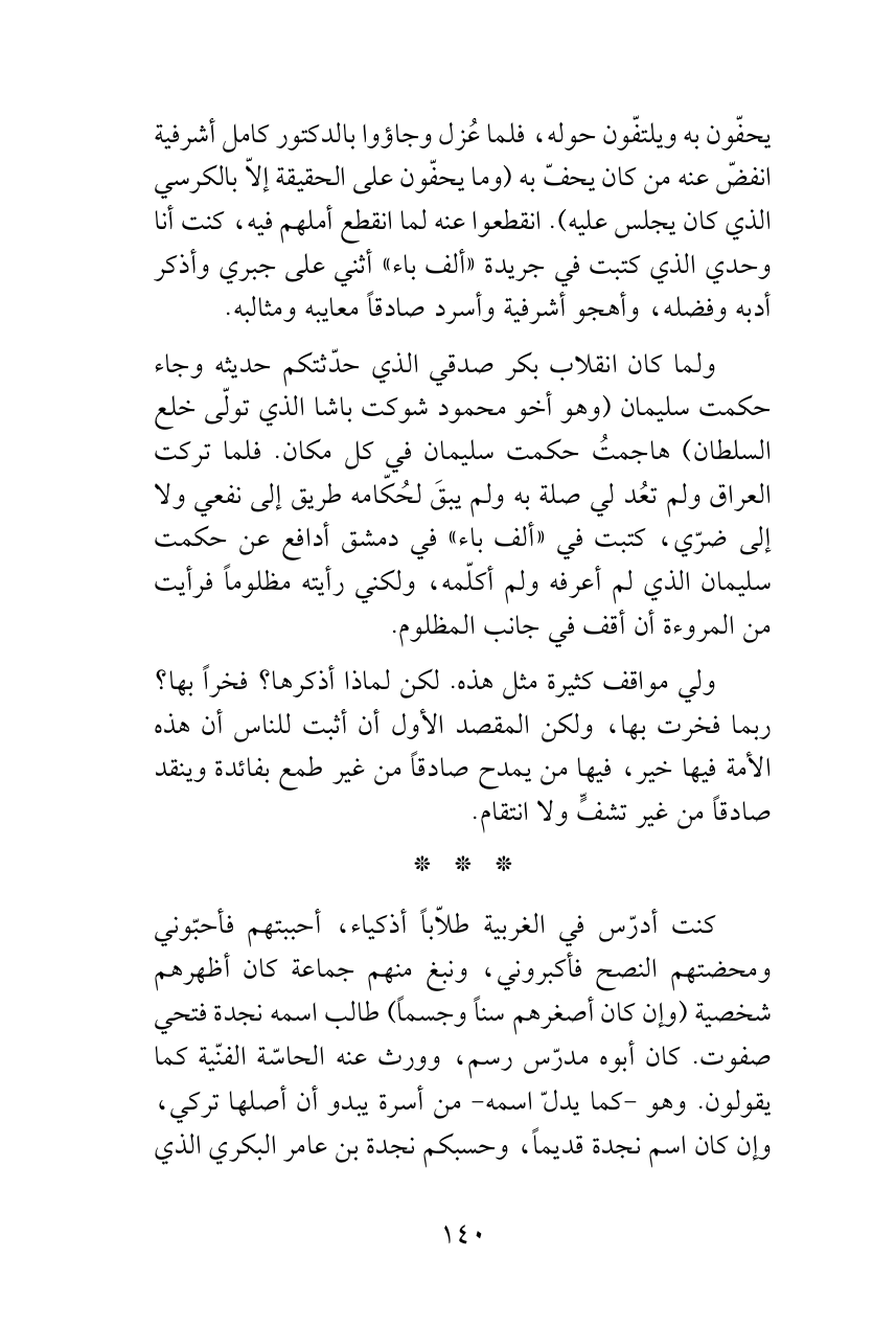 ولما كان انقلاب بكر صدقي الذي حدّثتكم حديثه وجاء حكمت سليمان (وهو أخو محمود شوكت باشا الذي تولّى خلع السلطان) هاجمتُ حكمت سليمان في كل مكان. فلما تركت العراق ولم تعُد لي صلة به ولم يبقَ لحُكّامه طريق إلى نفعي ولا إلى ضرّي، كتبت في «ألف باء» في دمشق أدافع عن حكمت سليمان الذي لم أعرفه ولم أكلّمه، ولكني رأيته مظلوماً فرأيت من المروءة أن أقف في جانب المظلوم.