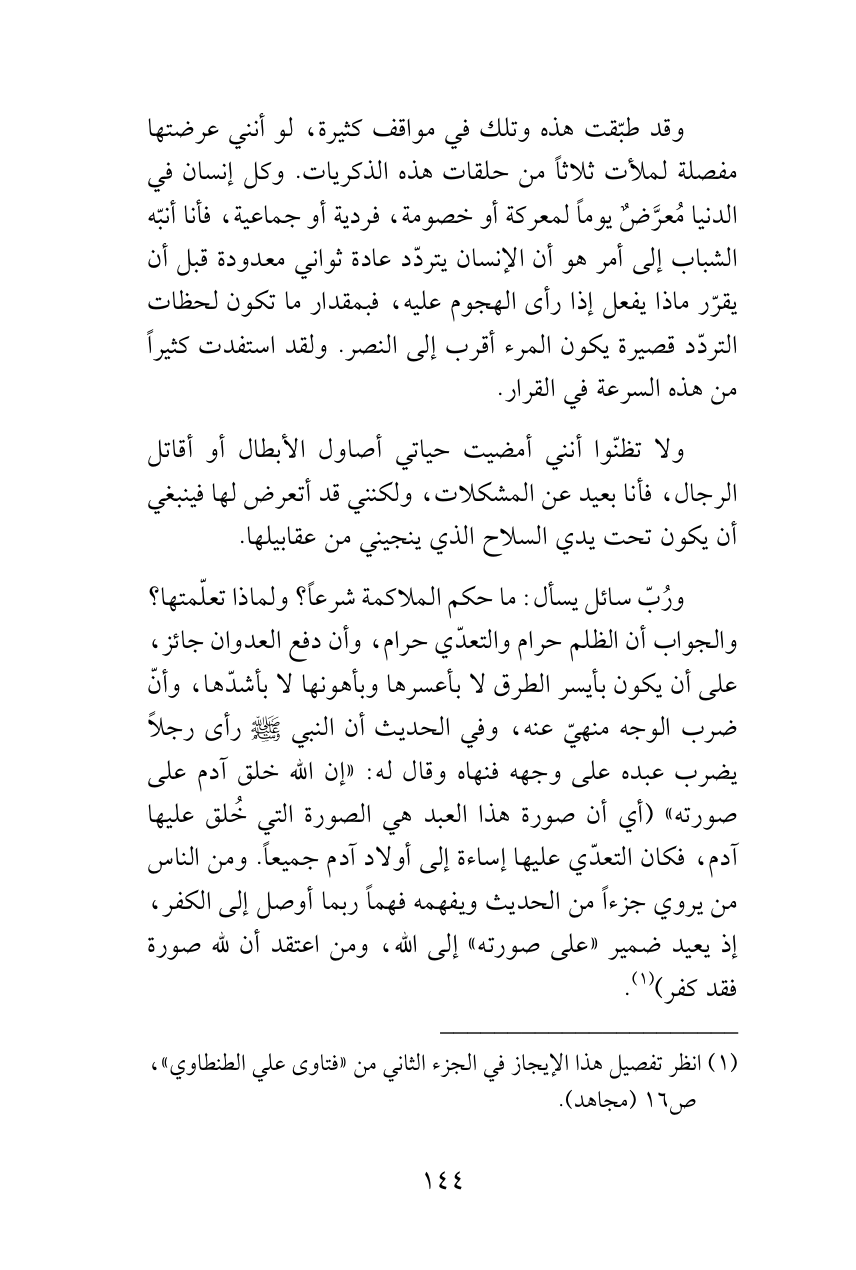 ورُبّ سائل يسأل: ما حكم الملاكمة شرعاً؟ ولماذا تعلّمتها؟ والجواب أن الظلم حرام والتعدّي حرام، وأن دفع العدوان جائز، على أن يكون بأيسر الطرق لا بأعسرها وبأهونها لا بأشدّها، وأنّ ضرب الوجه منهيّ عنه، وفي الحديث أن النبي ‘ رأى رجلاً يضرب عبده على وجهه فنهاه وقال له: «إن الله خلق آدم على صورته» (أي أن صورة هذا العبد هي الصورة التي خُلق عليها آدم، فكان التعدّي عليها إساءة إلى أولاد آدم جميعاً. ومن الناس من يروي جزءاً من الحديث ويفهمه فهماً ربما أوصل إلى الكفر، إذ يعيد ضمير «على صورته» إلى الله، ومن اعتقد أن لله صورة فقد كفر) (¬1).