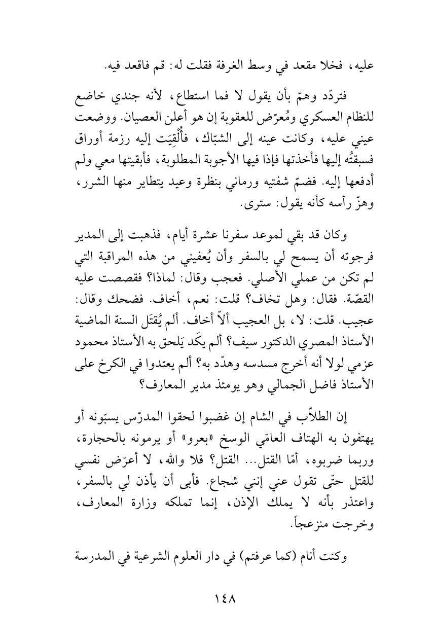 إن الطلاّب في الشام إن غضبوا لحقوا المدرّس يسبّونه أو يهتفون به الهتاف العامّي الوسخ «بعرو» أو يرمونه بالحجارة، وربما ضربوه، أمّا القتل ... القتل؟ فلا والله، لا أعرّض نفسي للقتل حتّى تقول عني إنني شجاع. فأبى أن يأذن لي بالسفر، واعتذر بأنه لا يملك الإذن، إنما تملكه وزارة المعارف، وخرجت منزعجاً.