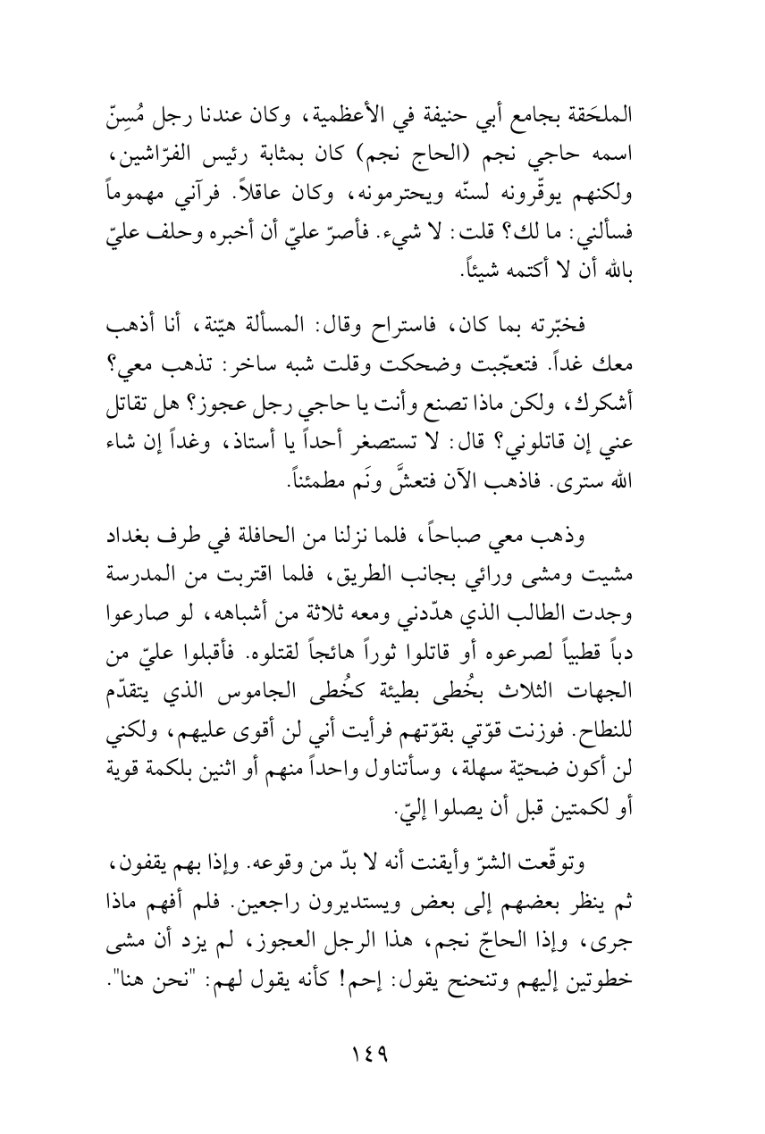 وتوقّعت الشرّ وأيقنت أنه لا بدّ من وقوعه. وإذا بهم يقفون، ثم ينظر بعضهم إلى بعض ويستديرون راجعين. فلم أفهم ماذا جرى، وإذا الحاجّ نجم، هذا الرجل العجوز، لم يزد أن مشى خطوتين إليهم وتنحنح يقول: إحم! كأنه يقول لهم: "نحن هنا".