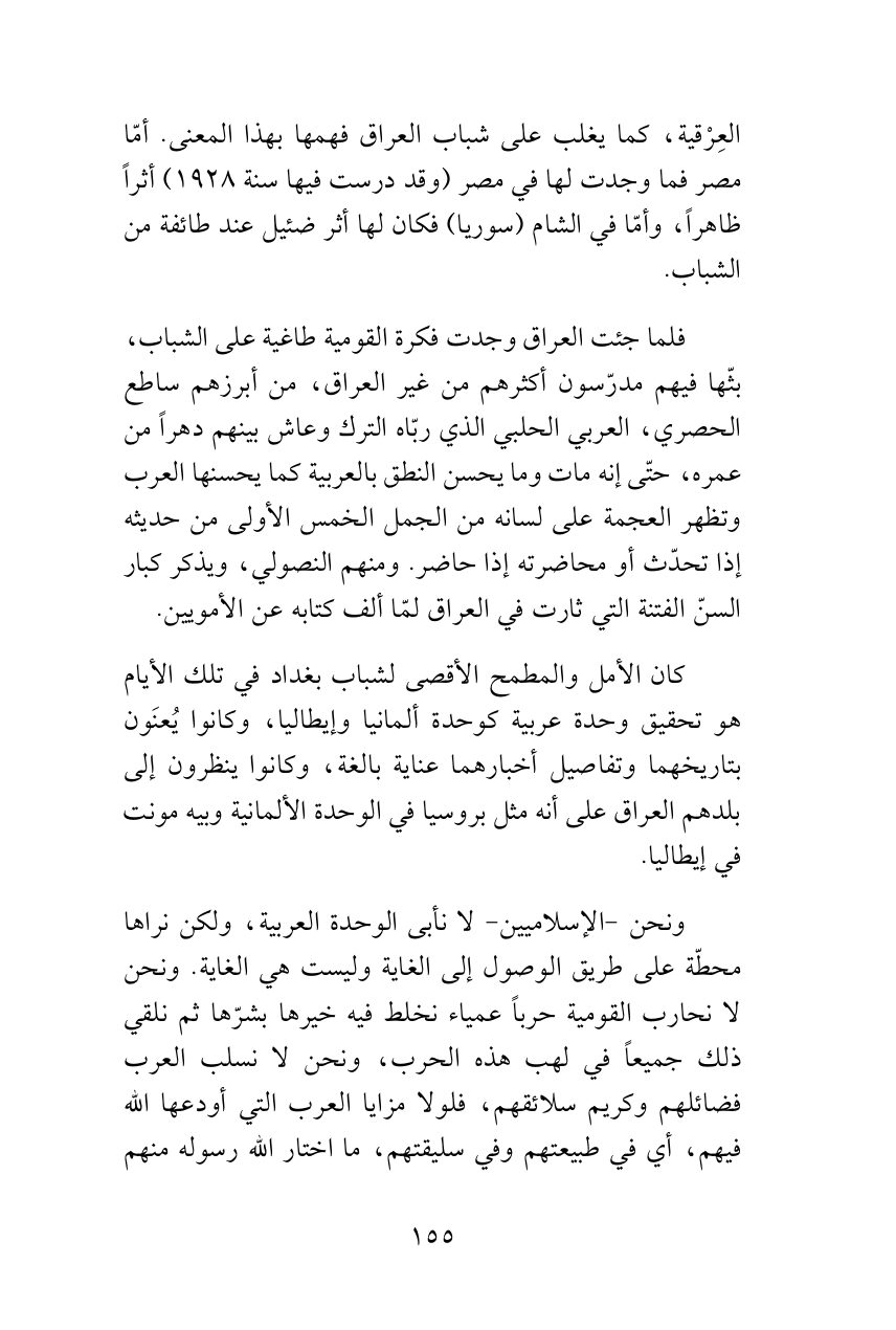 فلما جئت العراق وجدت فكرة القومية طاغية على الشباب، بثّها فيهم مدرّسون أكثرهم من غير العراق، من أبرزهم ساطع الحصري، العربي الحلبي الذي ربّاه الترك وعاش بينهم دهراً من عمره، حتّى إنه مات وما يحسن النطق بالعربية كما يحسنها العرب وتظهر العجمة على لسانه من الجمل الخمس الأولى من حديثه إذا تحدّث أو محاضرته إذا حاضر. ومنهم النصولي، ويذكر كبار السنّ الفتنة التي ثارت في العراق لمّا ألف كتابه عن الأمويين.