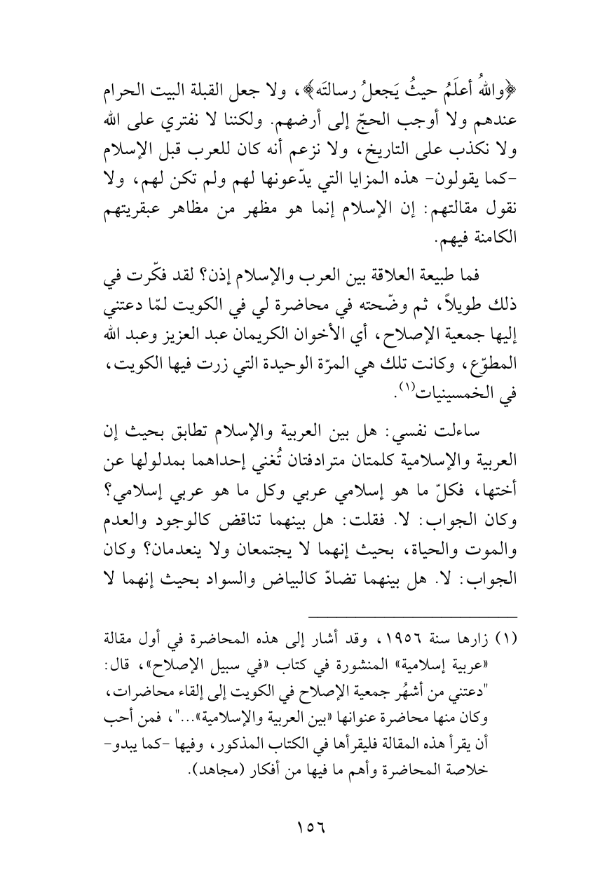 (¬1) زارها سنة 1956، وقد أشار إلى هذه المحاضرة في أول مقالة «عربية إسلامية» المنشورة في كتاب «في سبيل الإصلاح»، قال: "دعتني من أشهُر جمعية الإصلاح في الكويت إلى إلقاء محاضرات، وكان منها محاضرة عنوانها «بين العربية والإسلامية» ... "، فمن أحب أن يقرأ هذه المقالة فليقرأها في الكتاب المذكور، وفيها -كما يبدو- خلاصة المحاضرة وأهم ما فيها من أفكار (مجاهد).