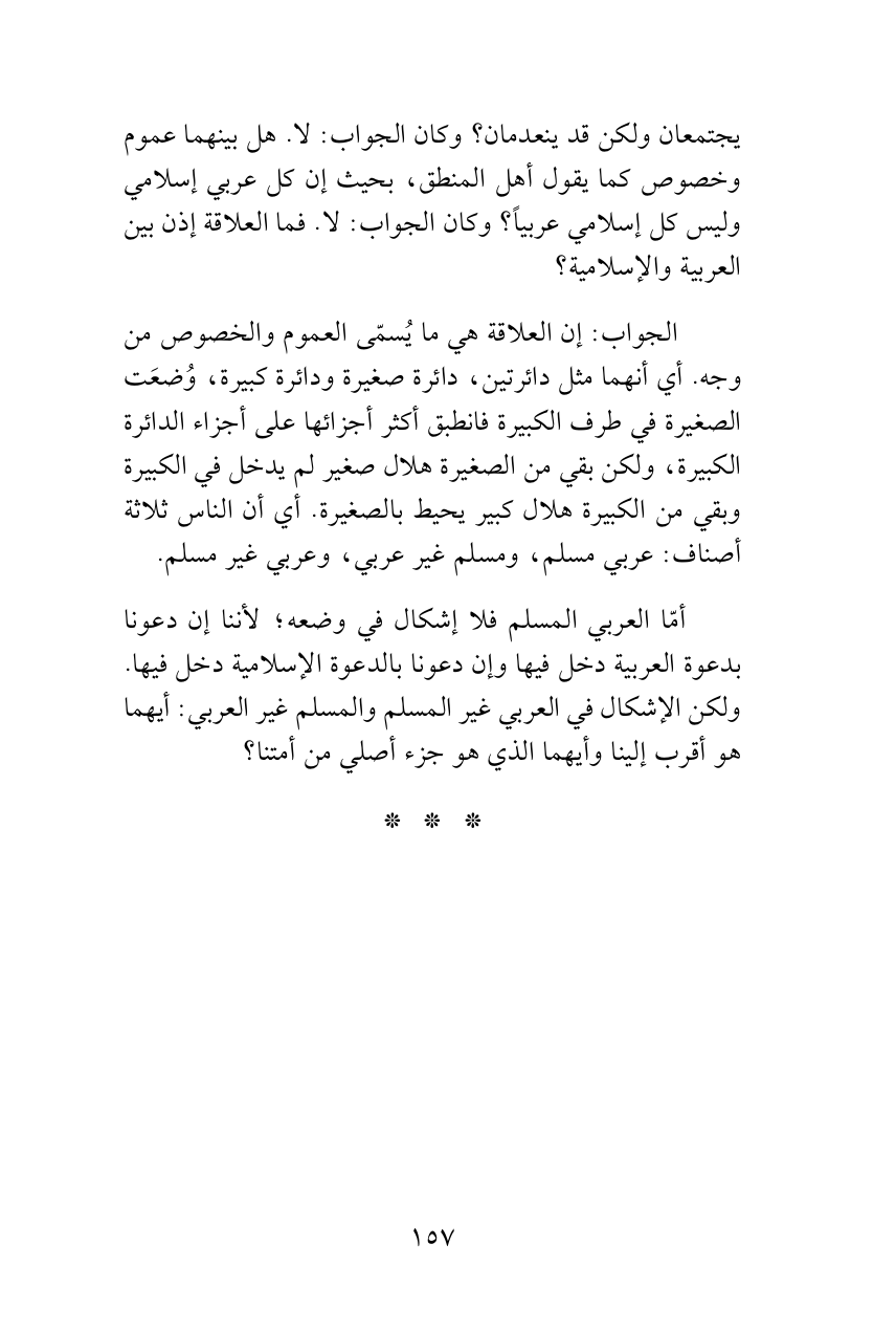 يجتمعان ولكن قد ينعدمان؟ وكان الجواب: لا. هل بينهما عموم وخصوص كما يقول أهل المنطق، بحيث إن كل عربي إسلامي وليس كل إسلامي عربياً؟ وكان الجواب: لا. فما العلاقة إذن بين العربية والإسلامية؟