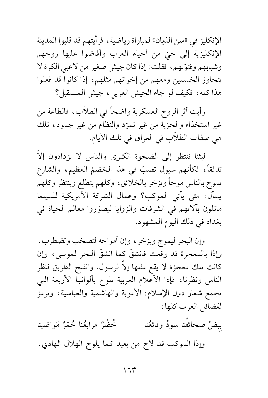 الإنكليز في «سن الذبان» لمباراة رياضية، فرأيتهم قد قلبوا المدينة الإنكليزية إلى حيّ من أحياء العرب وأفاضوا عليها روحهم وشبابهم وفتوّتهم، فقلت: إذا كان جيش صغير من لاعبي الكرة لا يتجاوز الخمسين ومعهم من إخوانهم مثلهم، إذا كانوا قد فعلوا هذا كله، فكيف لو جاء الجيش العربي، جيش المستقبل؟