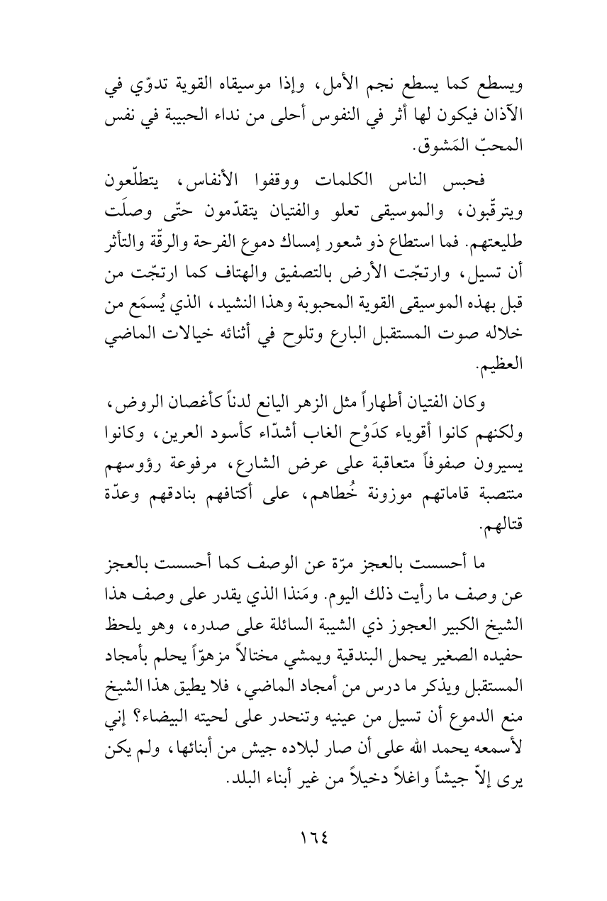 فحبس الناس الكلمات ووقفوا الأنفاس، يتطلّعون ويترقّبون، والموسيقى تعلو والفتيان يتقدّمون حتّى وصلَت طليعتهم. فما استطاع ذو شعور إمساك دموع الفرحة والرقّة والتأثر أن تسيل، وارتجّت الأرض بالتصفيق والهتاف كما ارتجّت من قبل بهذه الموسيقى القوية المحبوبة وهذا النشيد، الذي يُسمَع من خلاله صوت المستقبل البارع وتلوح في أثنائه خيالات الماضي العظيم.