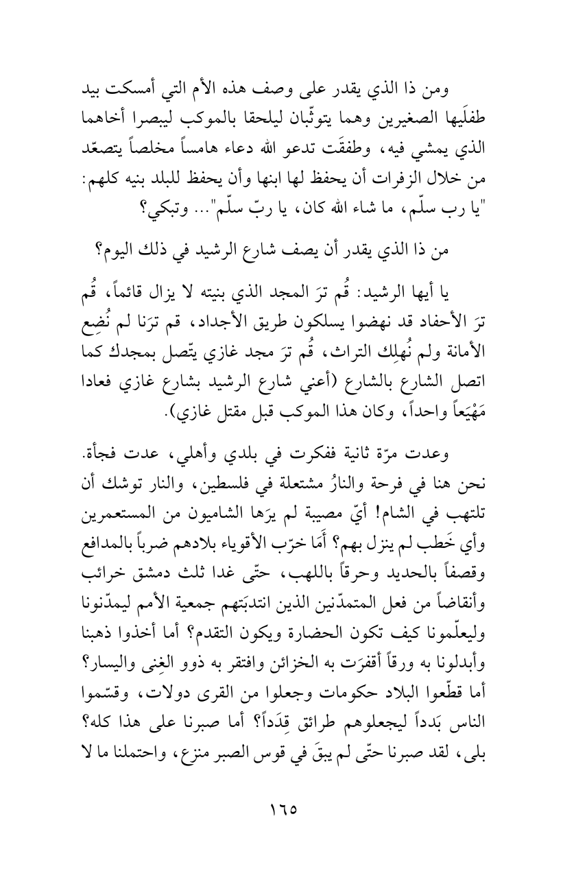 ومن ذا الذي يقدر على وصف هذه الأم التي أمسكت بيد طفلَيها الصغيرين وهما يتوثّبان ليلحقا بالموكب ليبصرا أخاهما الذي يمشي فيه، وطفقَت تدعو الله دعاء هامساً مخلصاً يتصعّد من خلال الزفرات أن يحفظ لها ابنها وأن يحفظ للبلد بنيه كلهم: "يا رب سلّم، ما شاء الله كان، يا ربّ سلّم" ... وتبكي؟