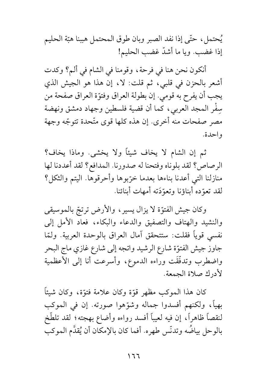 أنكون نحن هنا في فرحة، وقومنا في الشام في ألم؟ وكدت أشعر بالحزن في قلبي، ثم قلت: لا، إن هذا هو الجيش الذي يجب أن يفرح به قومي. إن بطولة العراق وفتوّة العراق صفحة من سِفْر المجد العربي، كما أن قضية فلسطين وجهاد دمشق ونهضة مصر صفحات منه أخرى. إن هذه كلها قوى متّحدة تتوجّه وجهة واحدة.