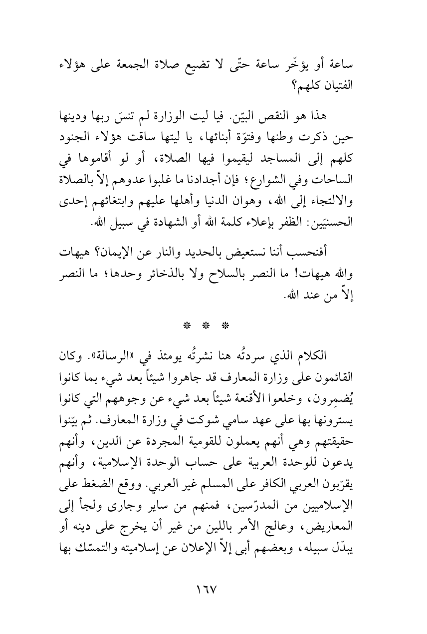 هذا هو النقص البيّن. فيا ليت الوزارة لم تنسَ ربها ودينها حين ذكرت وطنها وفتوّة أبنائها، يا ليتها ساقت هؤلاء الجنود كلهم إلى المساجد ليقيموا فيها الصلاة، أو لو أقاموها في الساحات وفي الشوارع؛ فإن أجدادنا ما غلبوا عدوهم إلاّ بالصلاة والالتجاء إلى الله، وهوان الدنيا وأهلها عليهم وابتغائهم إحدى الحسنيَين: الظفر بإعلاء كلمة الله أو الشهادة في سبيل الله.